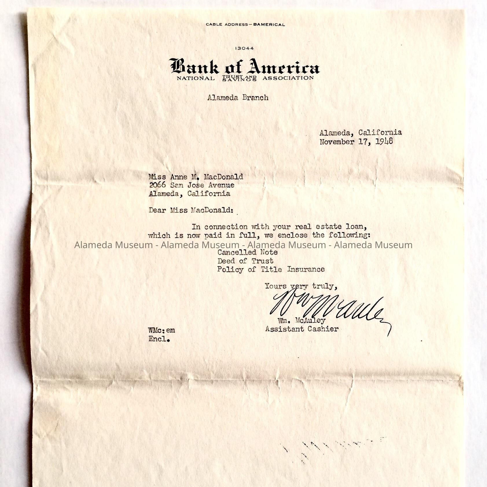 Letter from Bank of America to Anne Macdonald about loan payment, 1948Entry/Object ID