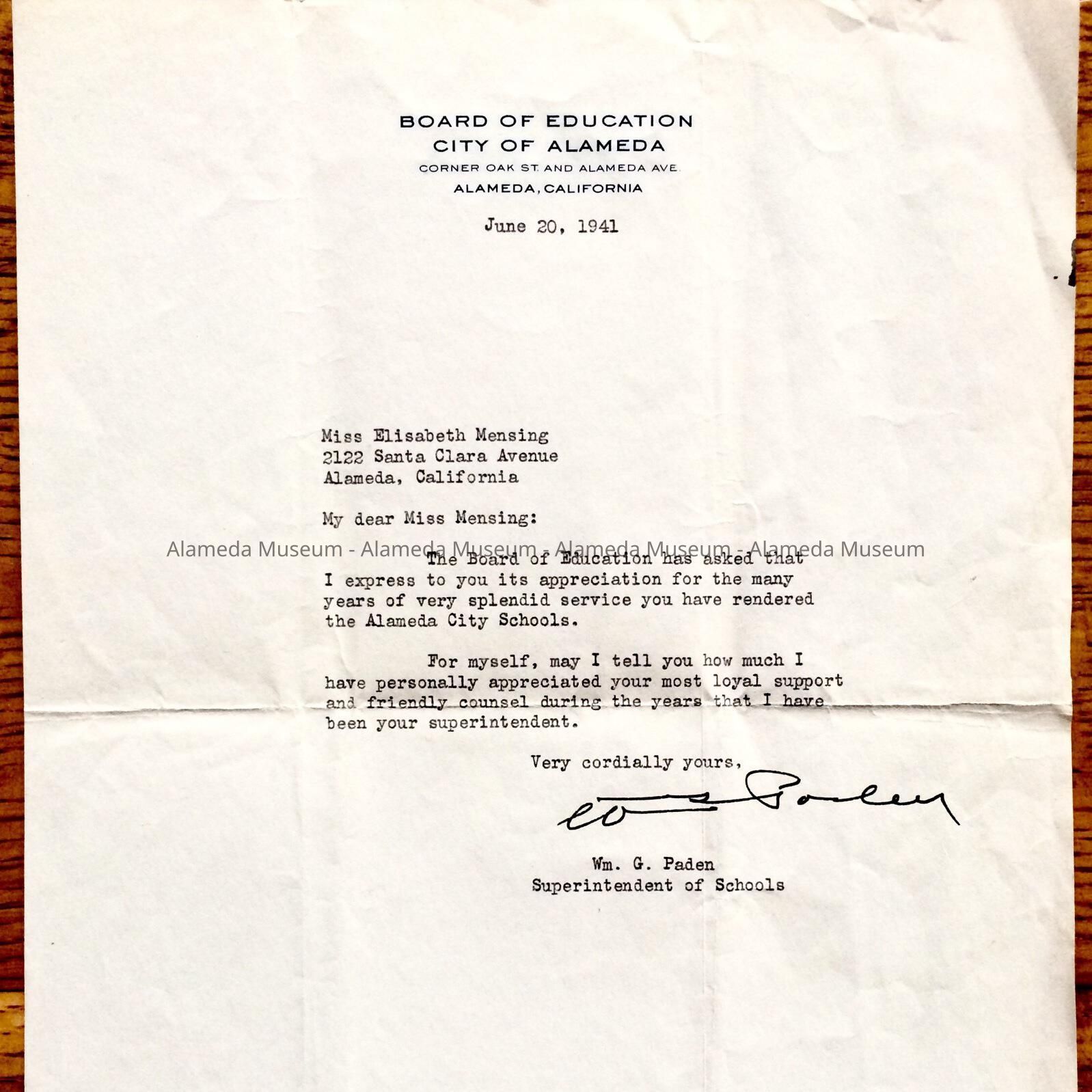 Letter addressed to Miss Elizabeth Mensing on behalf of the Board of Education extending their appreciation for her many years of service for the Alameda City Schools, signed by William G. Paden, Superintendent of Schools. Given to the Alameda Historical Society prior to 1971 and never catalogued.