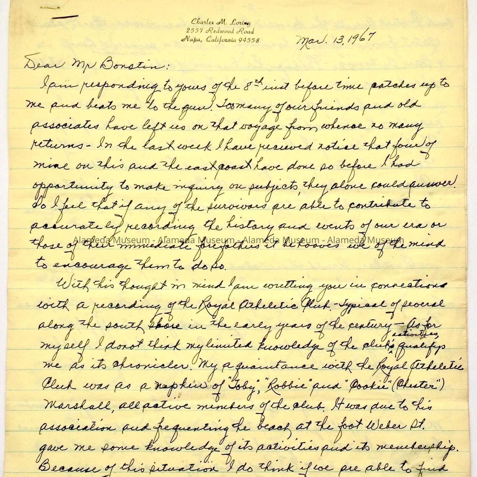 History of Object: Letter written to Bert Bonstin, past President of the Alameda Historical Society, where the author writes of the Royal Athletic Club and other events in Alameda in the late 1890's and early 1900's. The correspondence was given prior to 1971 and never catalogued.
