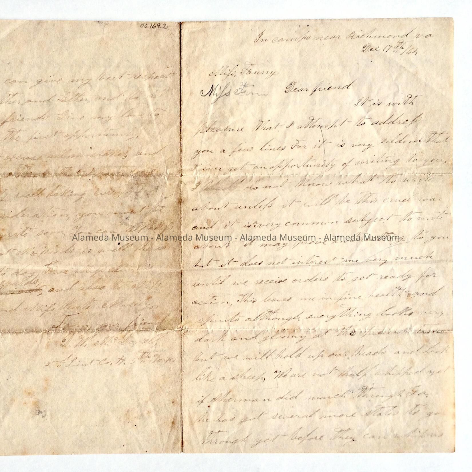 Letter written to Fannie from a camp near Richmond, VA, on December 17, 1864. It is signed by D.W. McDonell. Letter found among effects of McDonell family, pioneers of Bay Farm Island.