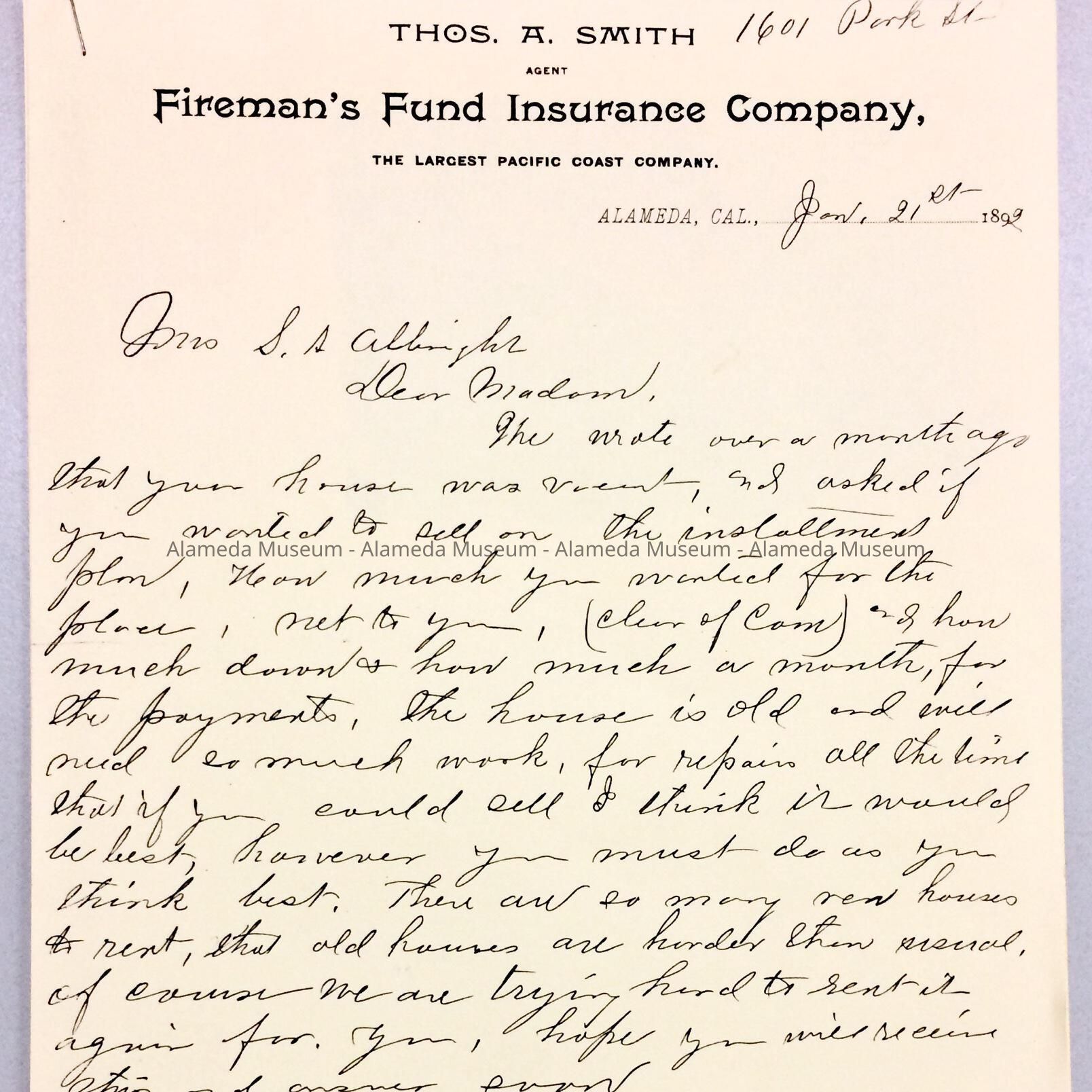 History: Letter from Thomas A. Smith, agent for Fireman's Fund Insurance Company to Mrs. S.A. Albright of Los Gatos concerning her property in Alameda. The letter is dated January 21, 1899.