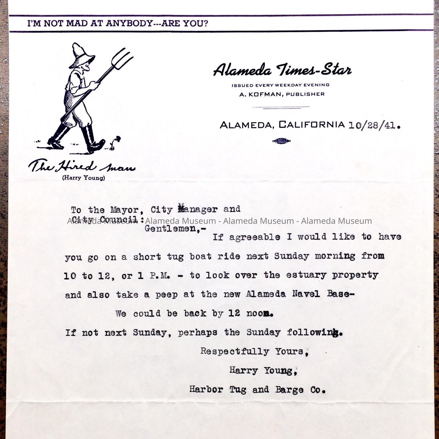 HISTORY OF OBJECT: A LETTER SIGNED BY HARRY YOUNG WHO WAS A COLUMNIST FOR THE ALAMEDA TIMES-STAR. LETTER WAS ADDRESSED TO THE MAYOR, CITY MANAGER, AND CITY COUNCIL. IT WAS AN INVITATION TO A TUG BOAT EXCURSION ON ESTUARY PROPERTY OFFERING A VIEW OF THE ALAMEDA NAVAL AIR STATION.