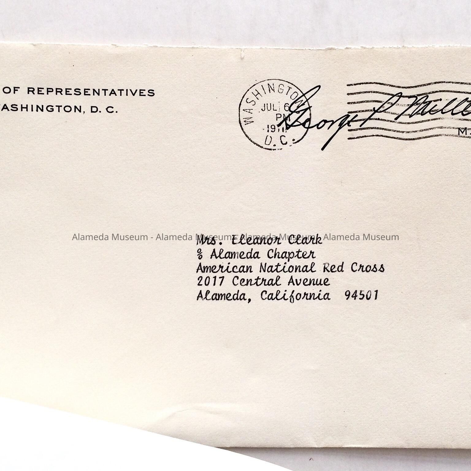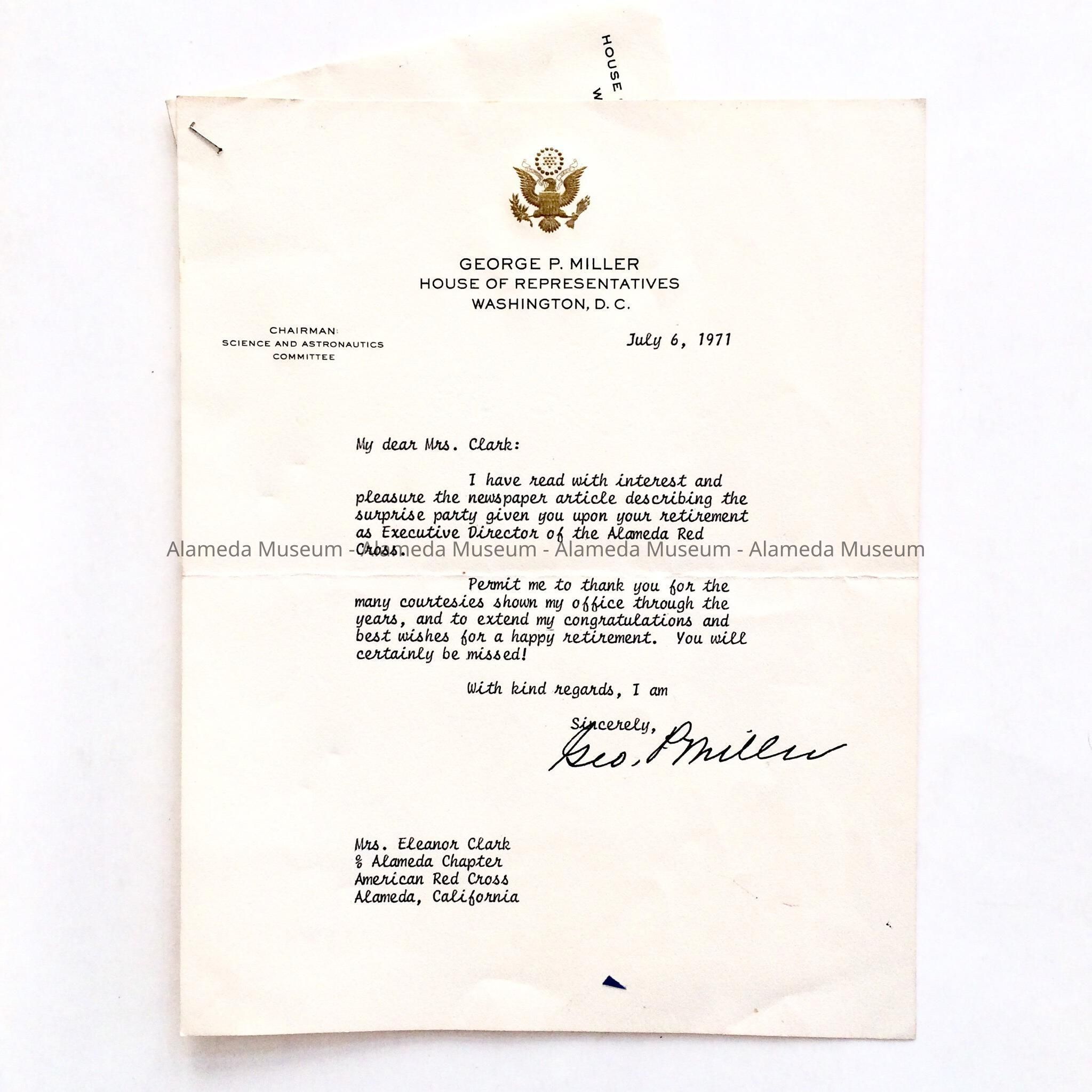 History of Object: Letter sent to Ms. Eleanor Clark upon her retirement as Executive Director of the Alameda Red Cross, from George P. Miller, House of Representatives, Washington, D. C., July 6, 1971.