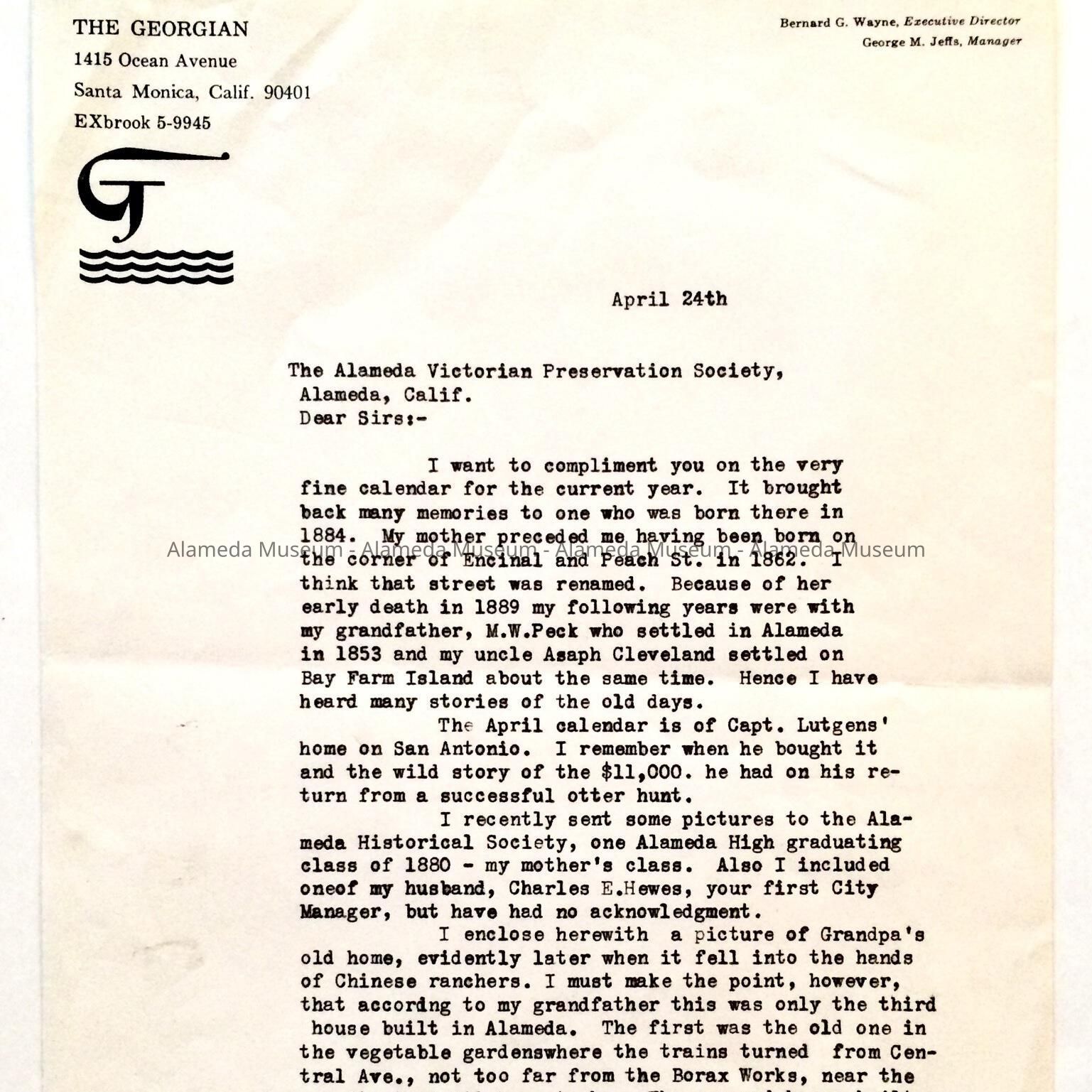 TYPEWRITTEN LETTER ON STATIONERY WHICH HAS PRINTED CAPTION IN BLACK-COLORED TYPE, "THE GEORGIAN, SANTA MONICA, CALIF."