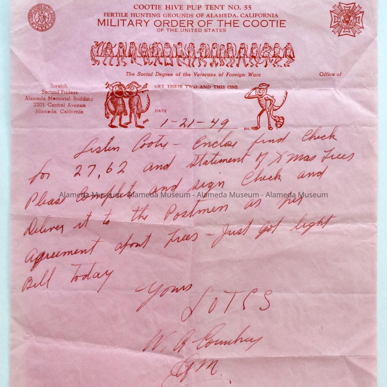 A LETTER FROM THE SOCIAL ORDER OF THE VETERANS OF FOREIGN WARS (UFW), WHICH HELD THEIR MEETINGS ON THE SECOND FRIDAY OF EACH MONTH, AT THE ALAMEDA VETERANS' MEMORIAL BUILDING, 2201 CENTRAL AVENUE. THE LETTER PERTAINS TO DUES.