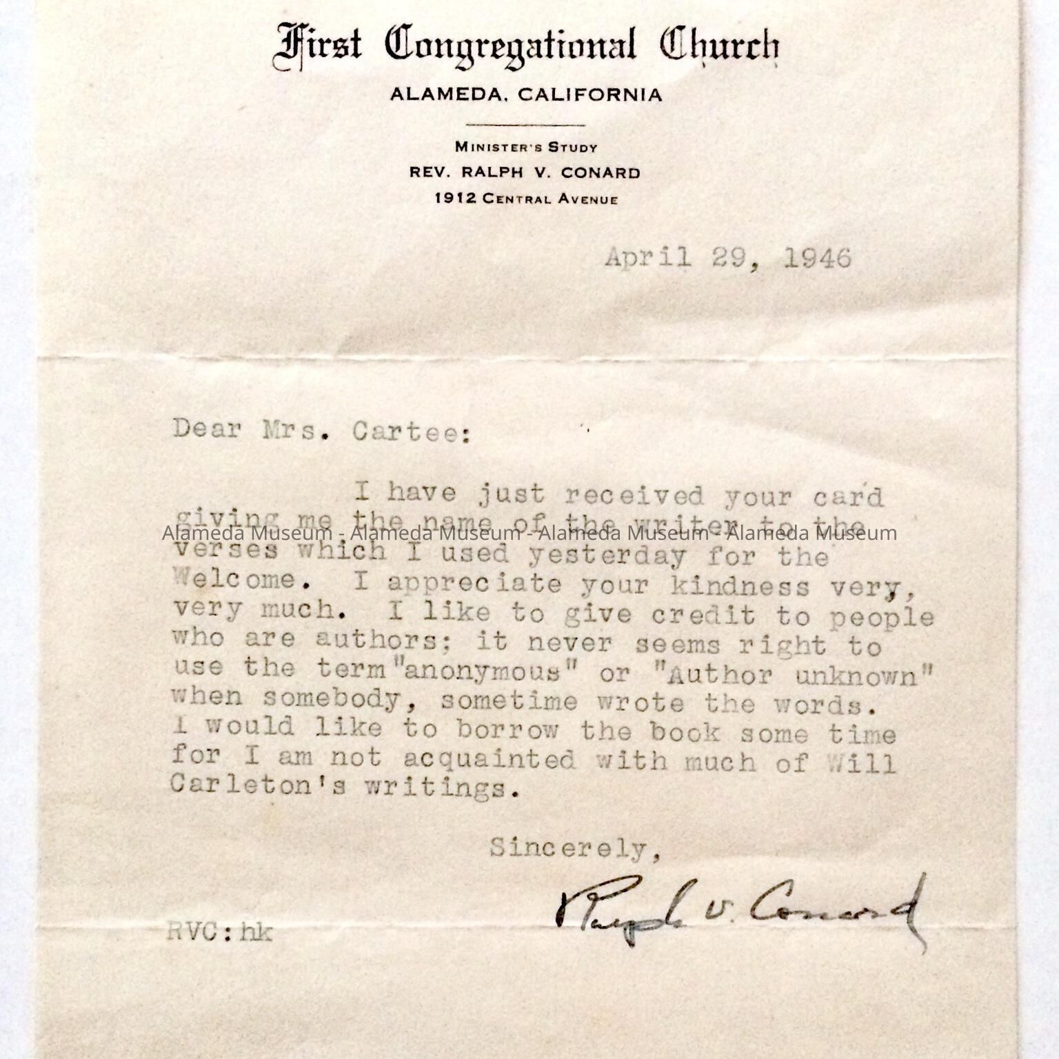 History: Letter addressed to Mrs. Cartee from Reverend Ralph V. Conard, Pastor of the 1st Congregational Church, Alameda, dated April 29, 1946, thanking Mrs. Cartee for information