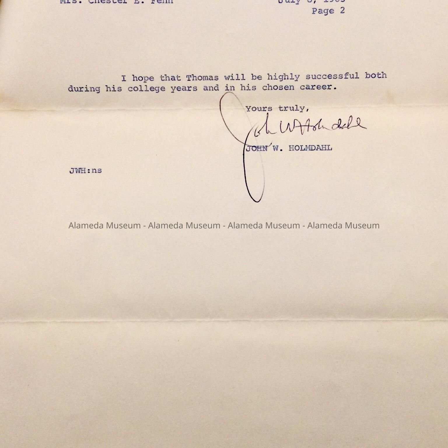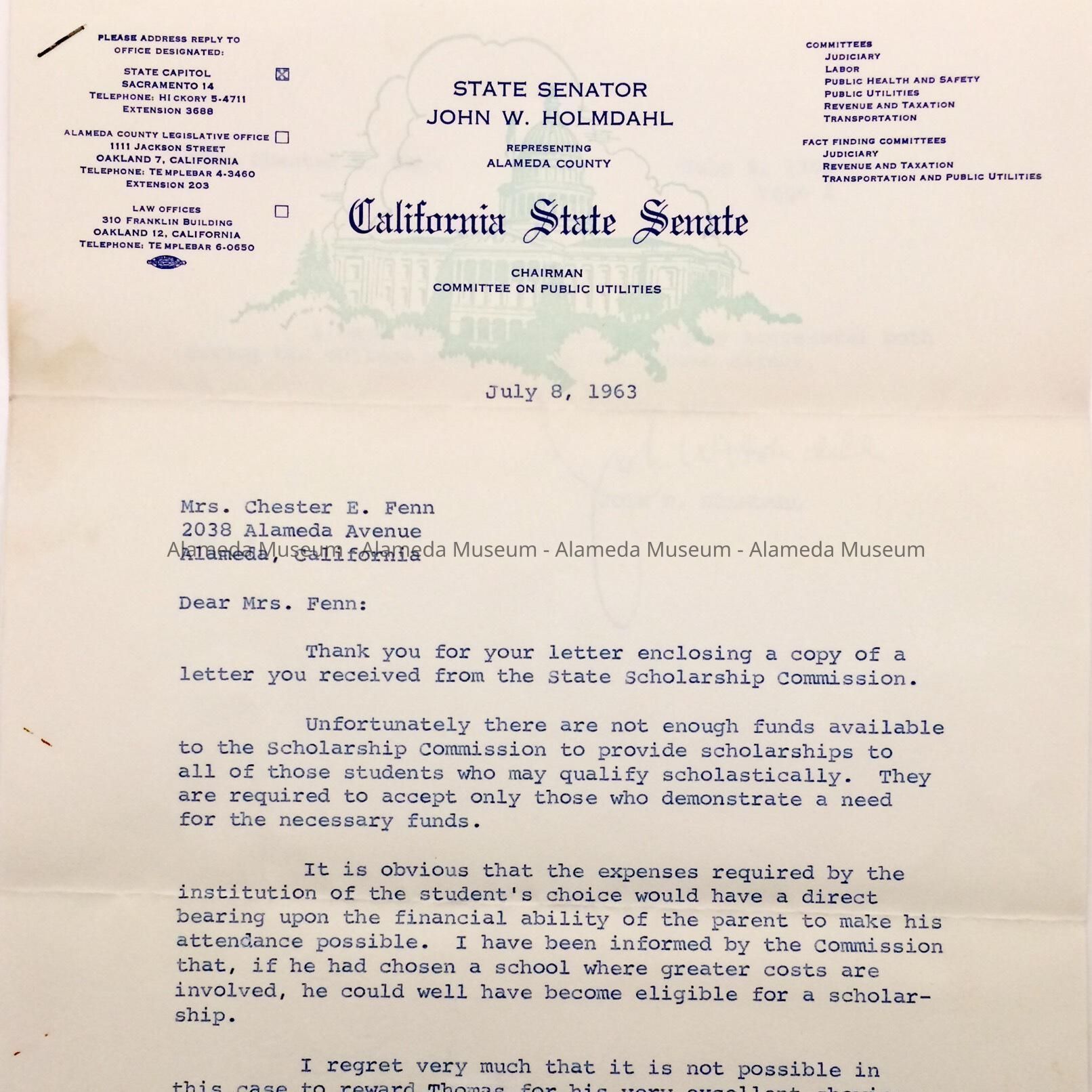 HISTORY OF OBJECT: A LETTER OF REPLY TO MR. CHESTER E. FENN OF 2038 ALAMEDA AVENUE, CONCERNING FUNDS FOR SCHOLARSHIPS TO STUDENTS WITH HIGH APTITUDES. THE LETTER IS SIGNED BY STATE SENATOR JOHN W. HOLMDAHL.