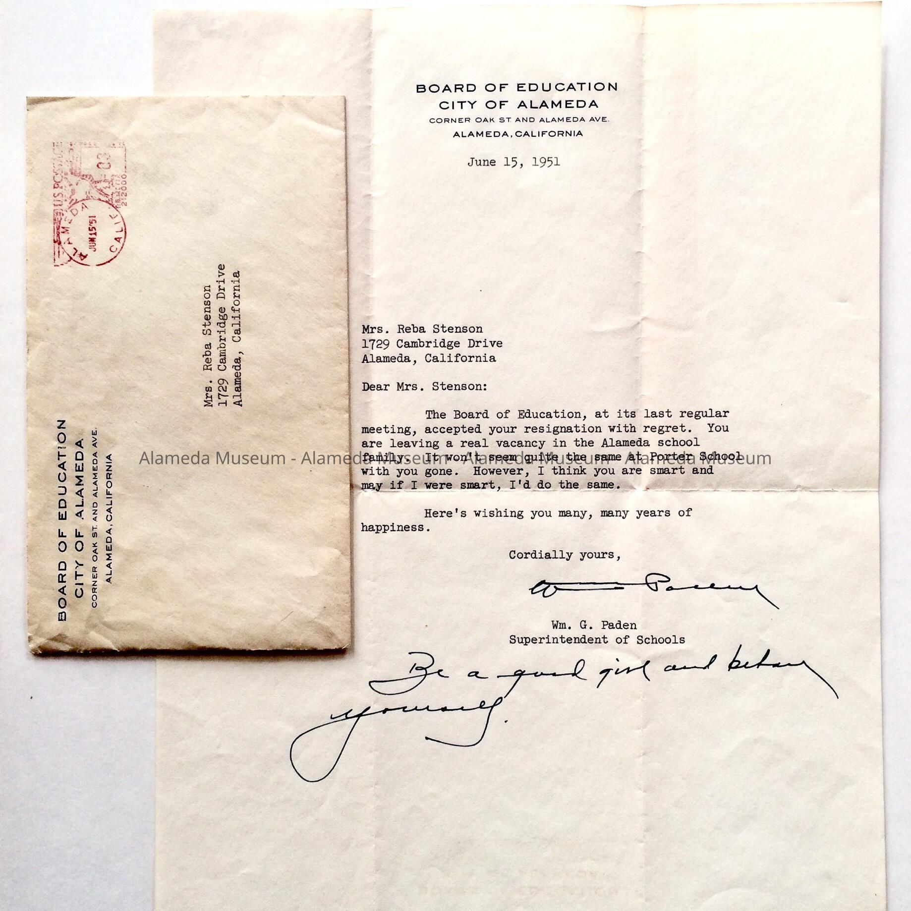 LETTER ADDRESSED TO MRS REBA STENSON, 1729 CAMBRIDGE DRIVE, ALAMEDA, EXPRESSING THE WRITER'S REGRETS ON THE OCCASION OF REBA'S RETIREMENT FROM THE PORTER SCHOOL; SIGNED BY WILLIAM J PADEN, SUPERINTENDENT OF SCHOOLS.