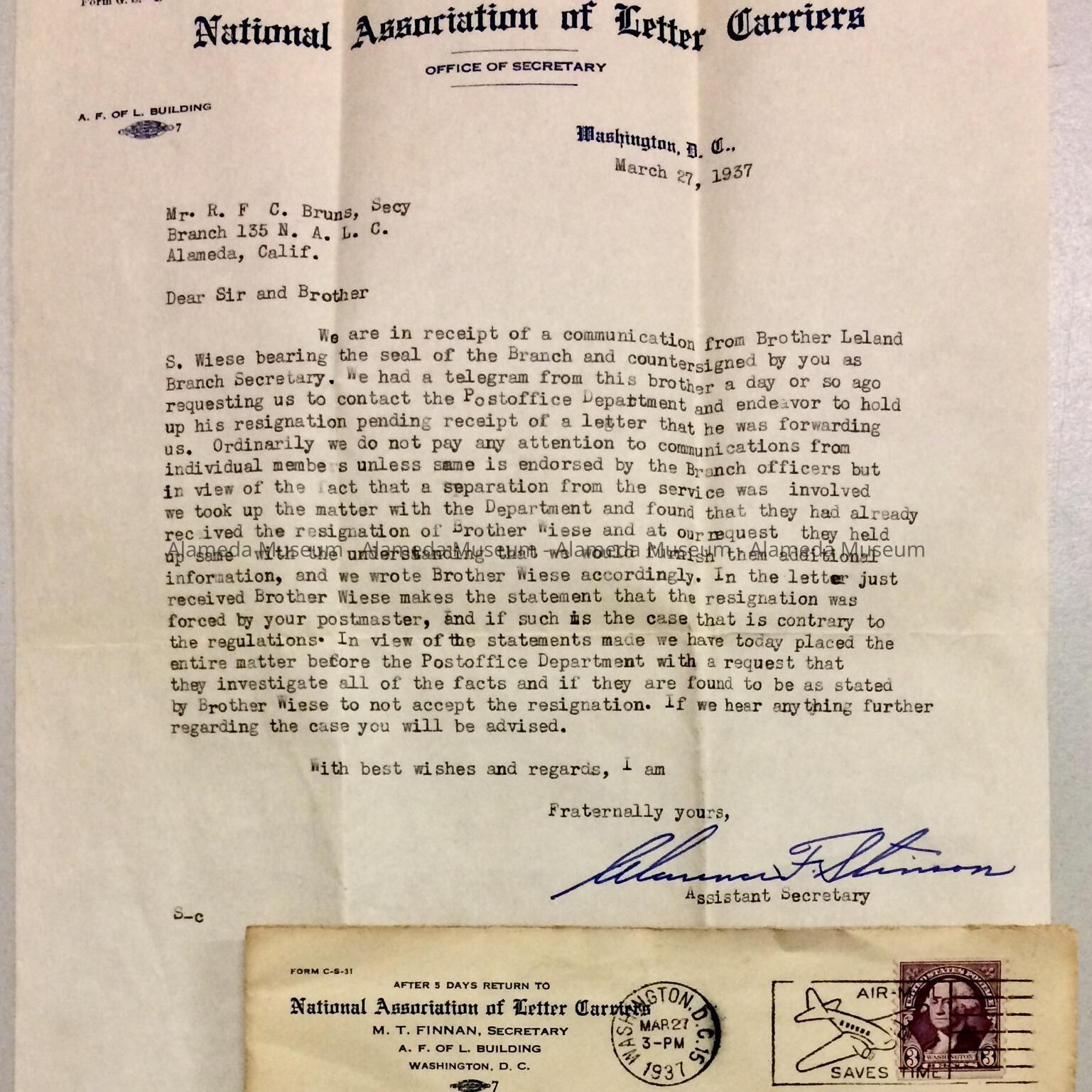 LETTER ADDRESSED TO R F C BRUNS, SECRETARY, BRANCH #135, N A L C, ALAMEDA, CONCERNING LELAND S WIESE'S RESIGNATION FROM THE ALAMEDA POST OFFICE. THE CORRESPONDENCE IS SIGNED BY CLARENCE F STINSON, ASSISTANT SECRETARY OF N A L C.