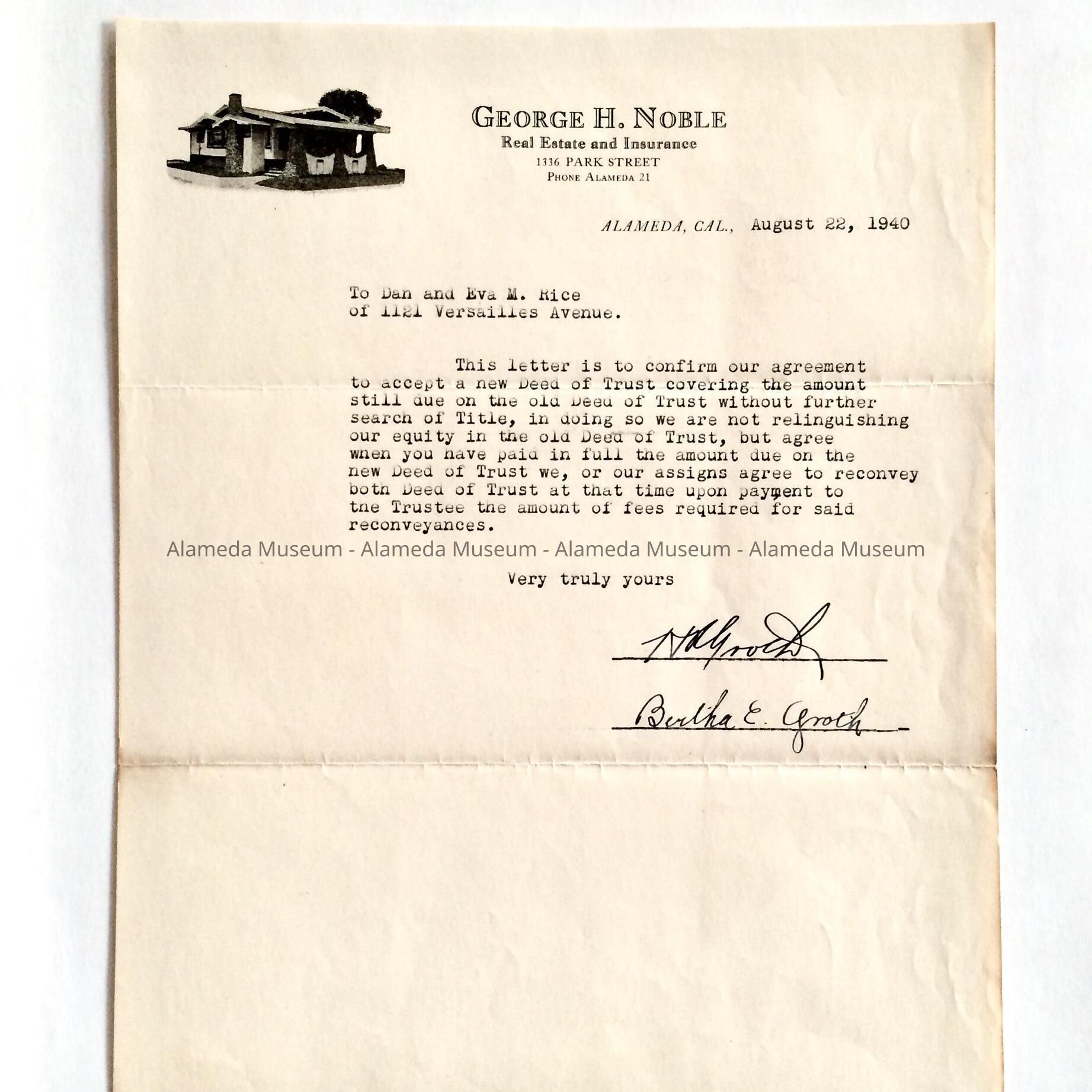 Letter of confirmation concerning new Deed of Trust, 1121 Versailles Avenue, agreement made between Dan & Eva M. Rice with H. & Bertha E. Groth., dated August 22, 1940.