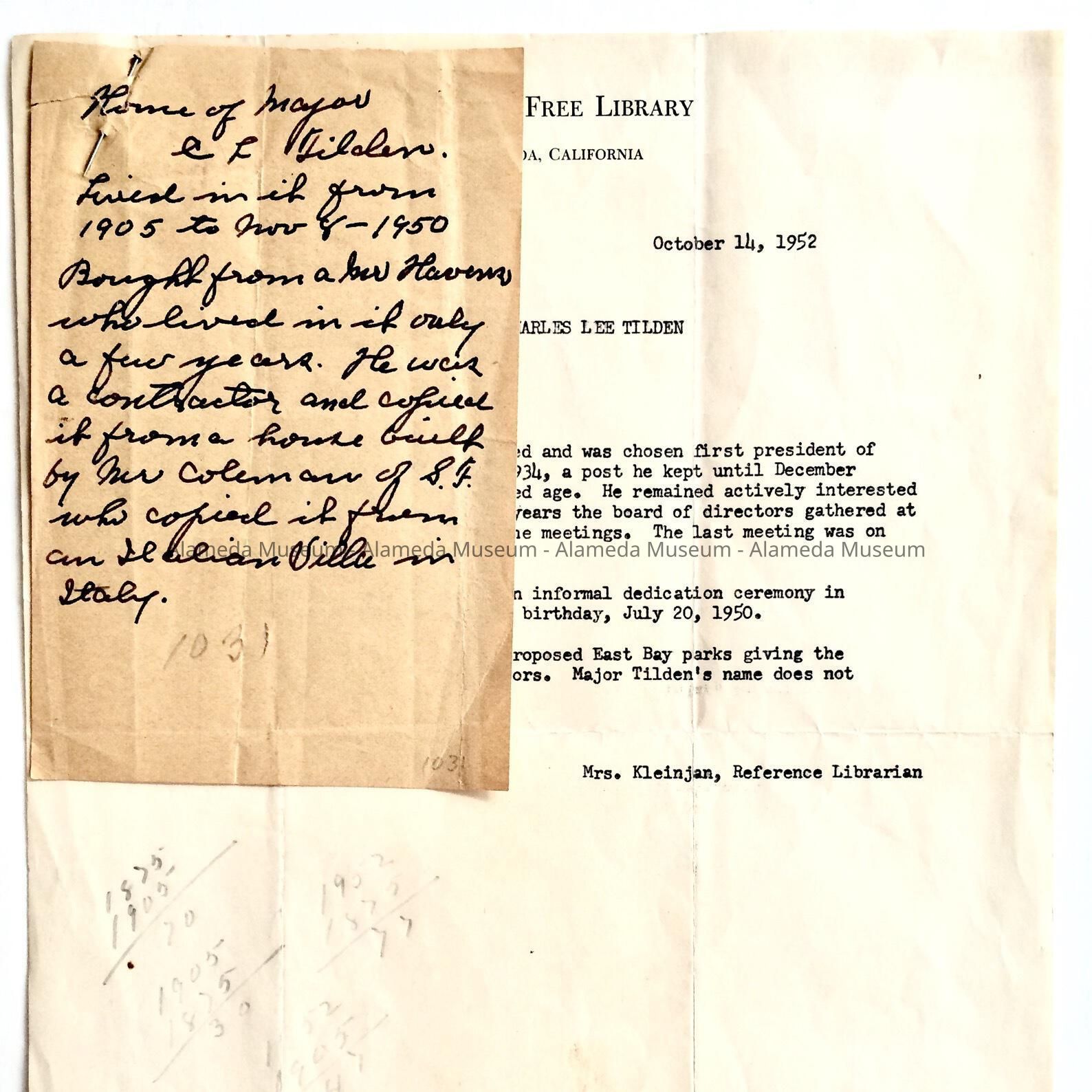 ONE-PAGE TYPEWRITTEN INFORMATION SHEET ON ALAMEDA FREE LIBRARY STATIONERY, DATED OCTOBER 14, 1952.