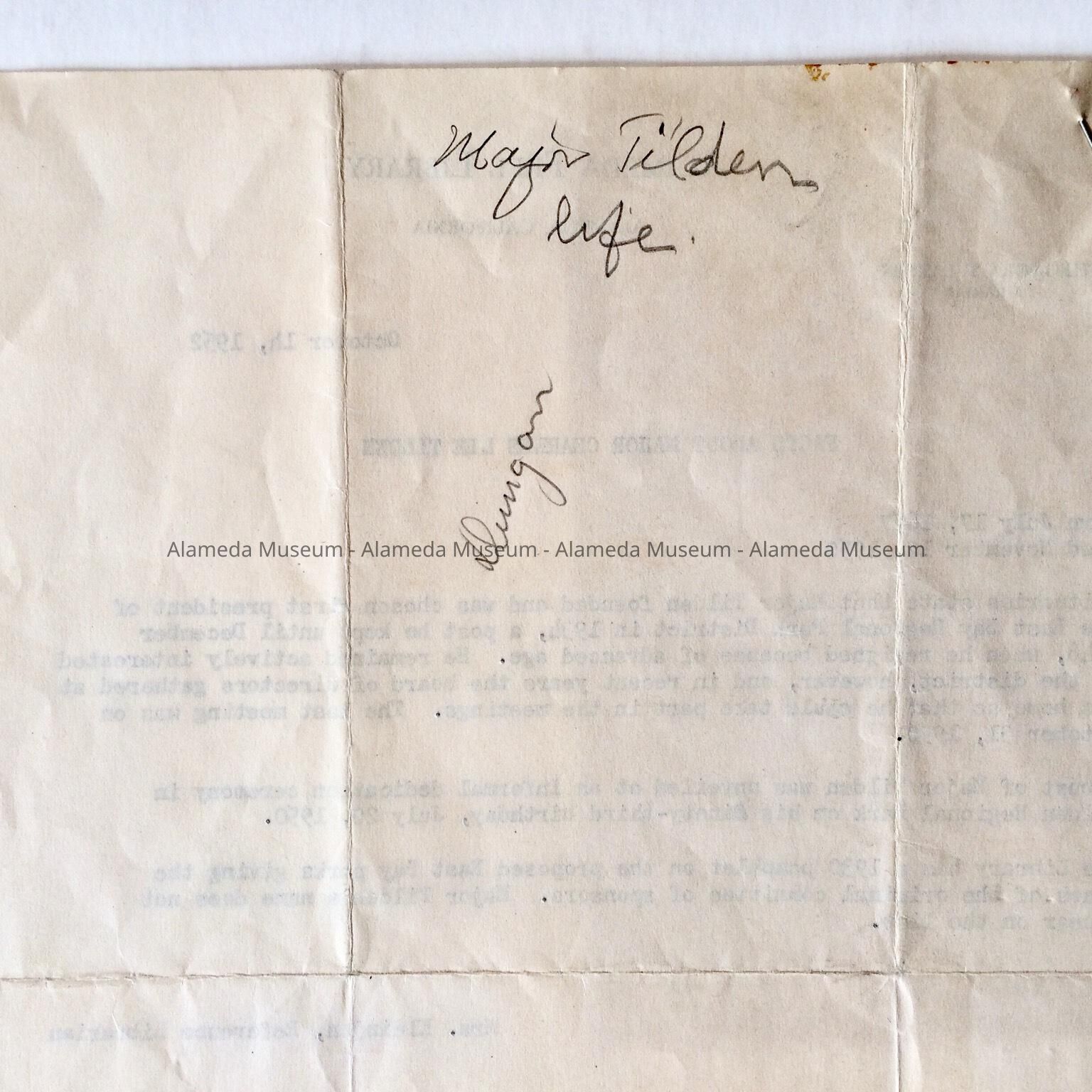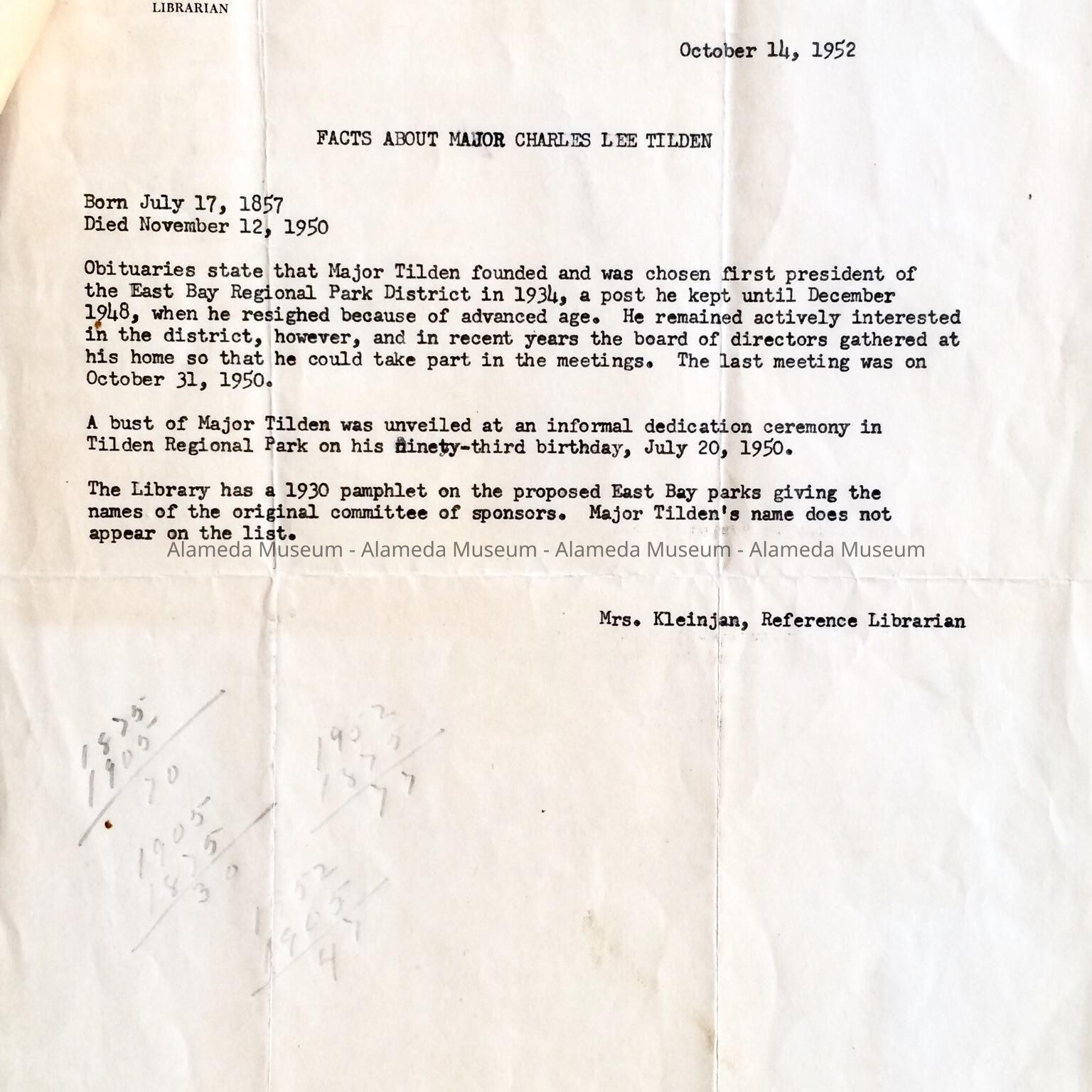 A ONE-PAGE BRIEF OF INFORMATION ON MAJOR CHARLES A TILDEN, WHO WAS A RESIDENT OF ALAMEDA FROM 1905 TO 1950. INFORMATION INCLUDES HIS LONG ASSOCIATION WITH THE EAST BAY REGIONAL PARK DISTRICT. THE INFORMATION WAS PROVIDED BY MRS KLEINGAN, REFERENCE LIBRARIAN. DOCUMENT WAS GIVEN TO THE ALAMEDA HISTORICAL SOCIETY PRIOR TO 1971 AND NOT DOCUMENTED AT THAT TIME.