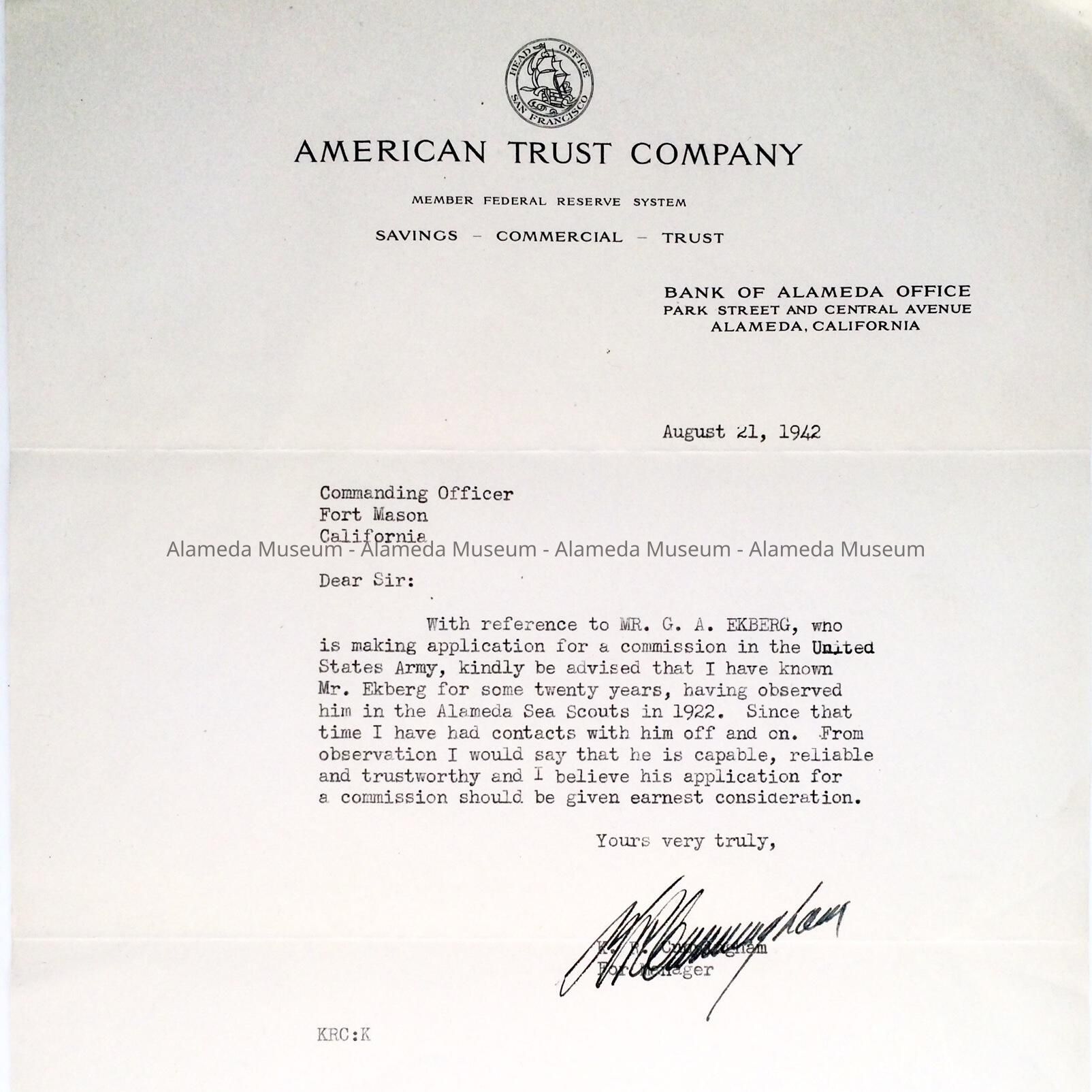 LETTER OF RECOMMENDATION REGARDING GUSTAF EKBERG AND HIS APPLICATION FOR COMMISSION IN THE U S ARMY, SIGNED "K R CUNNINGHAM," WHO HAD KNOWN MR EKBERG SINCE BEING IN THE SEA SCOUTS IN 1922.