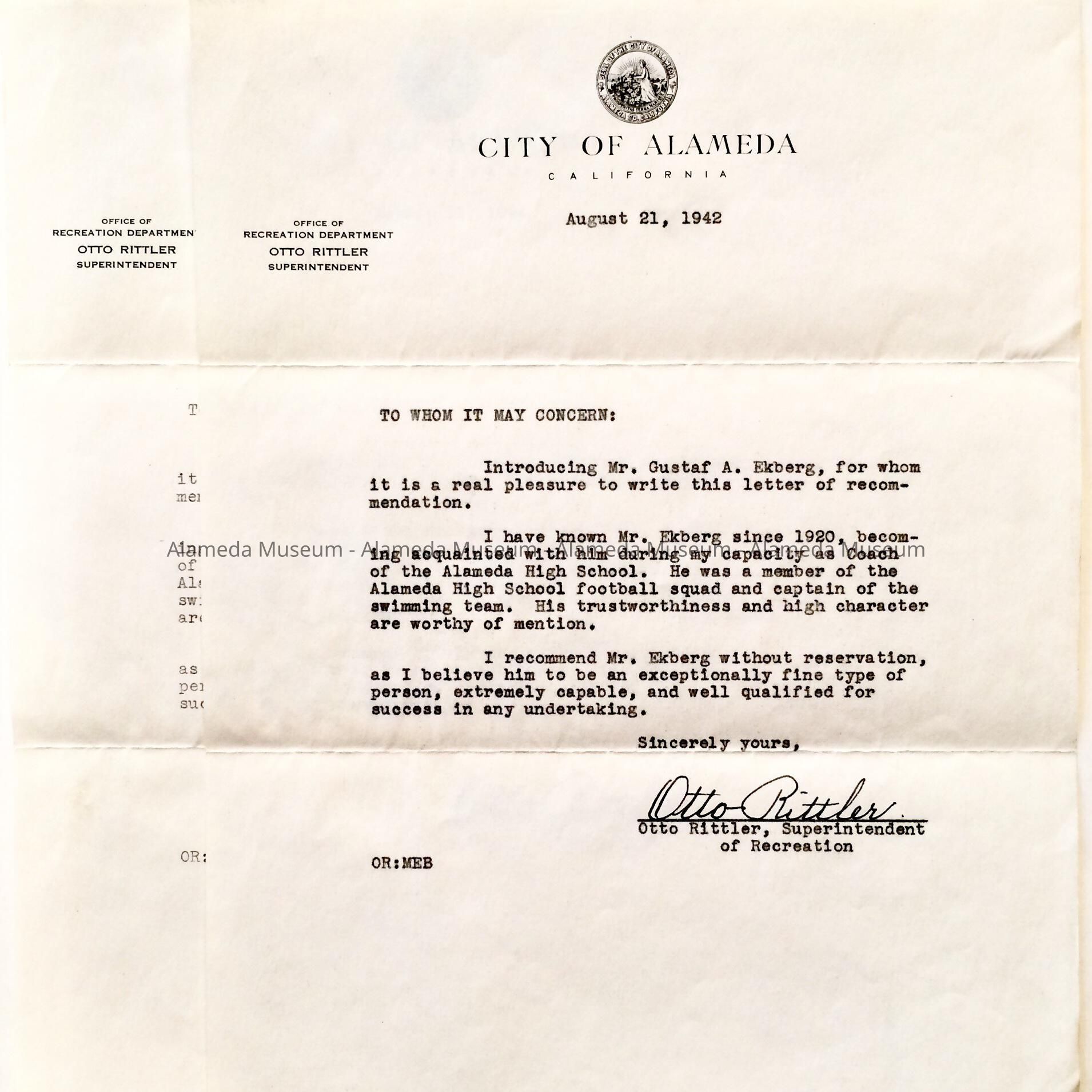 A LETTER OF RECOMMENDATION, INTRODUCING GUSTAF A EKBERG, ALAMEDA RESIDENT, SIGNED BY OTTO RITTLER, SUPERINTENDENT OF RECREATION. MR RITTLER BECAME ACQUAINTED WITH GUS EKBERG WHEN HE WAS A STUDENT OF THE ALAMEDA HIGH SCHOOL IN THE 1920's.