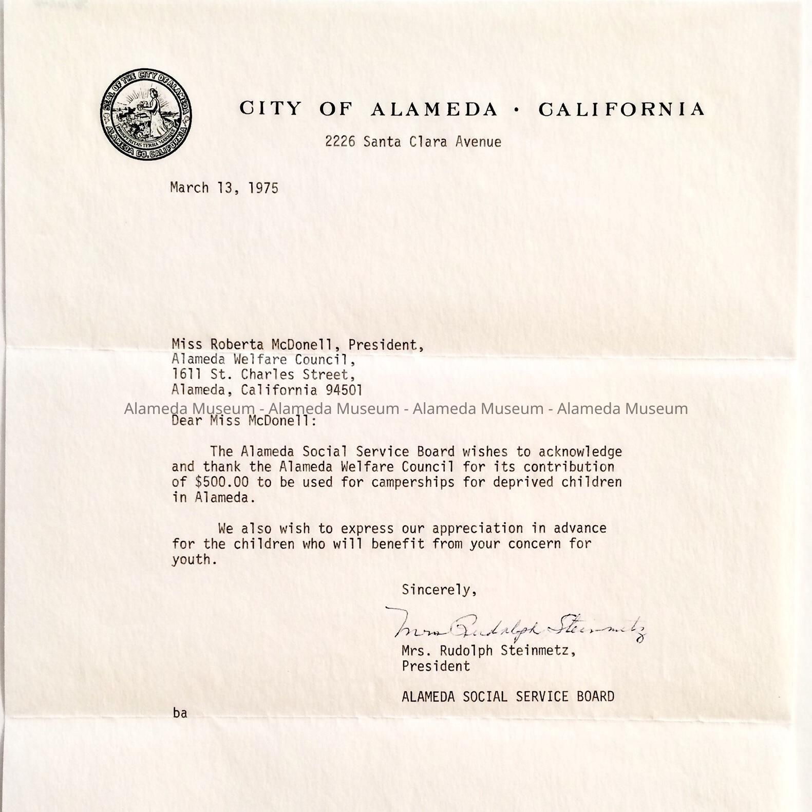 HISTORY OF OBJECT: LETTER ADDRESSED TO ROBERTA MCDONELL, PRESIDENT, ALAMEDA WELFARE COUNCIL, DATED MARCH 11, 1975. THE LETTER IS FROM THE ALAMEDA SOCIAL SERVICES BOARD, THANKING THE ALAMEDA WELFARE COUNCIL FOR ITS CONTRIBUTION FOR DEPRIVED CHILDREN.