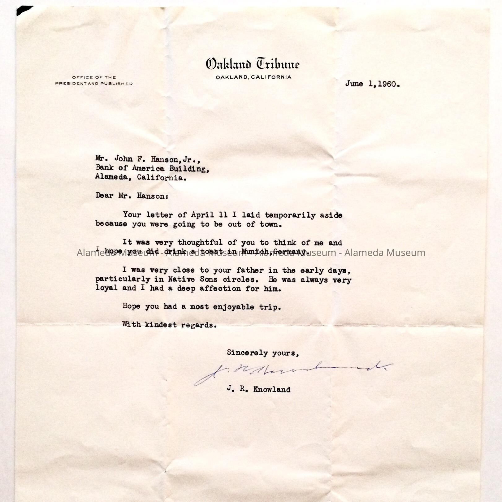 Letter on Oakland Tribune stationery about John F. Hanson, 1960Entry/Object ID
