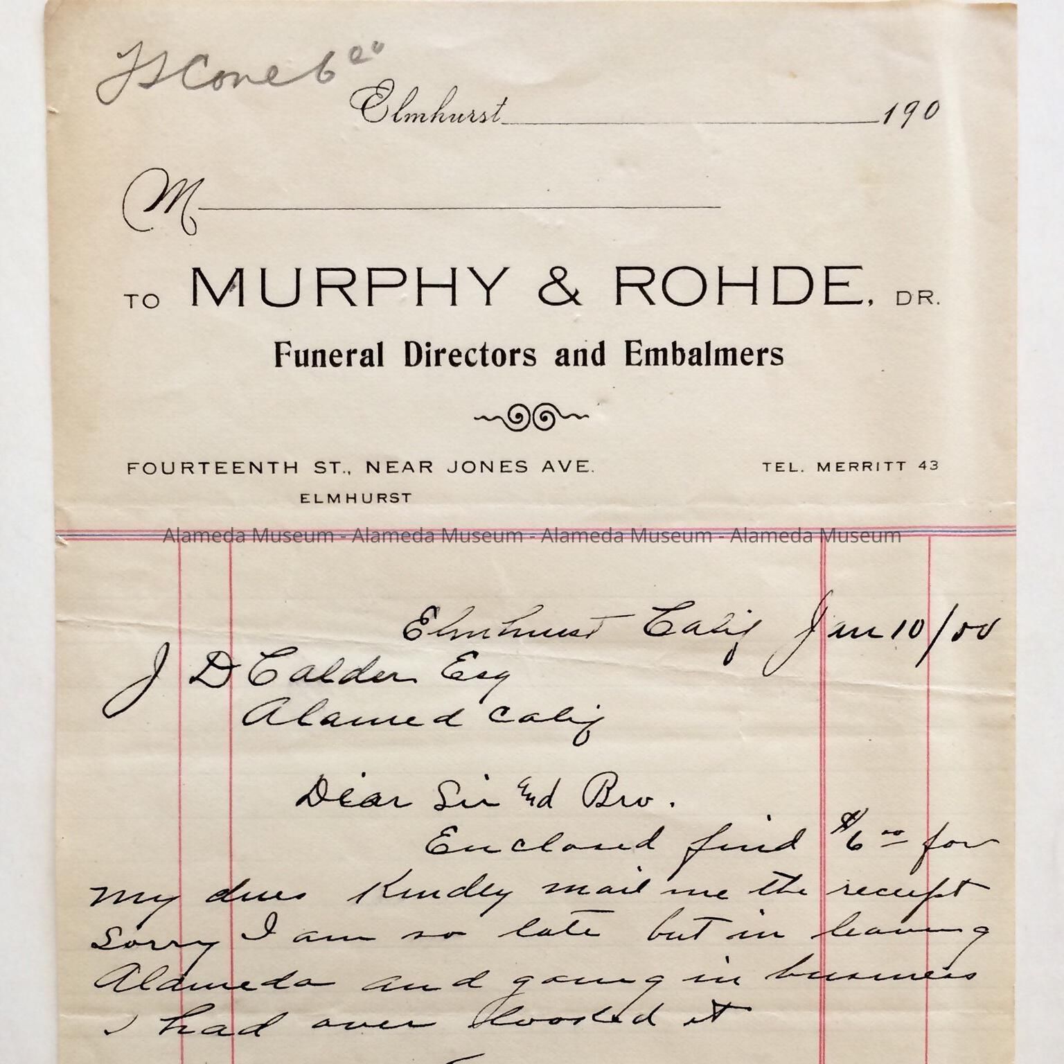 Description: Hand written letter with billhead "Murphy and Rohde Funeral Directors and Embalmers".