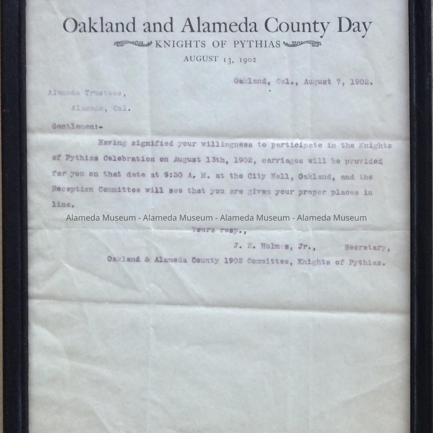 History of Object: Letter addressed to the Board of Alameda Trustees informing them that a carriage will be provided for their participation in a Knights of Pythias celebration, held in Oakland, August 13, 1902.