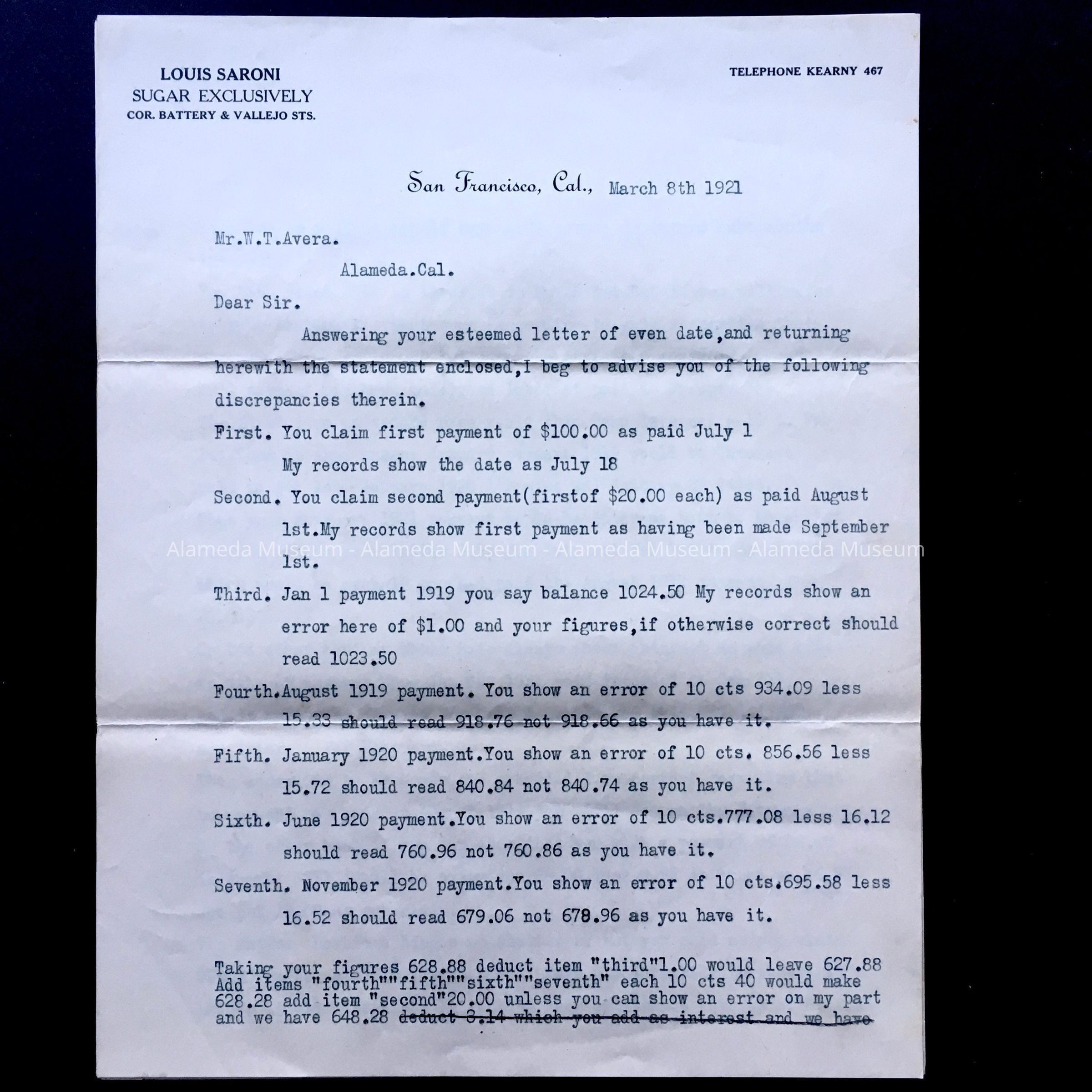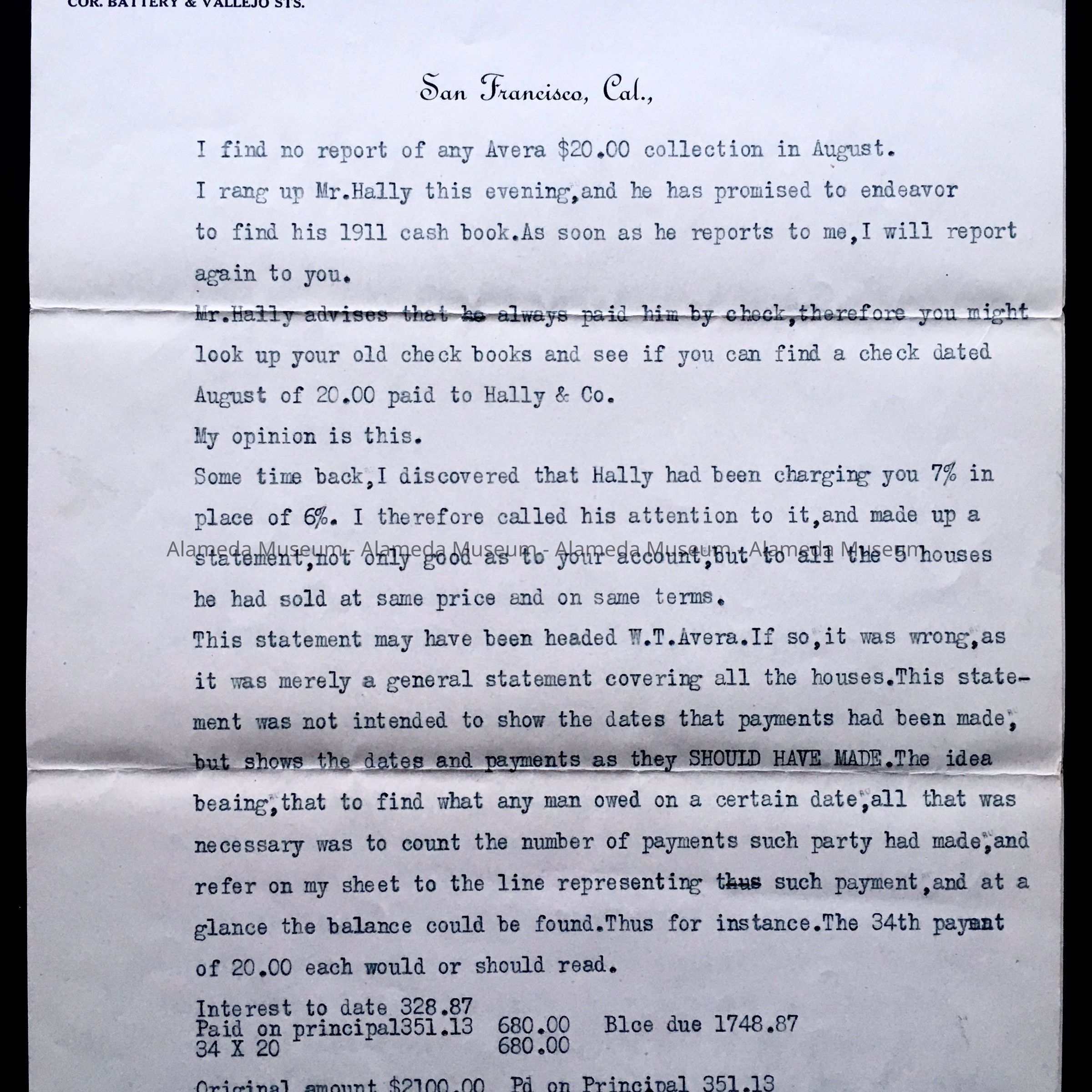 History of Object: Letter to W. T. Avera from Louis Saroni (agent & brother of Mrs. David Hirschfeld) concerning monthly payments on 3261 Garfield Avenue.