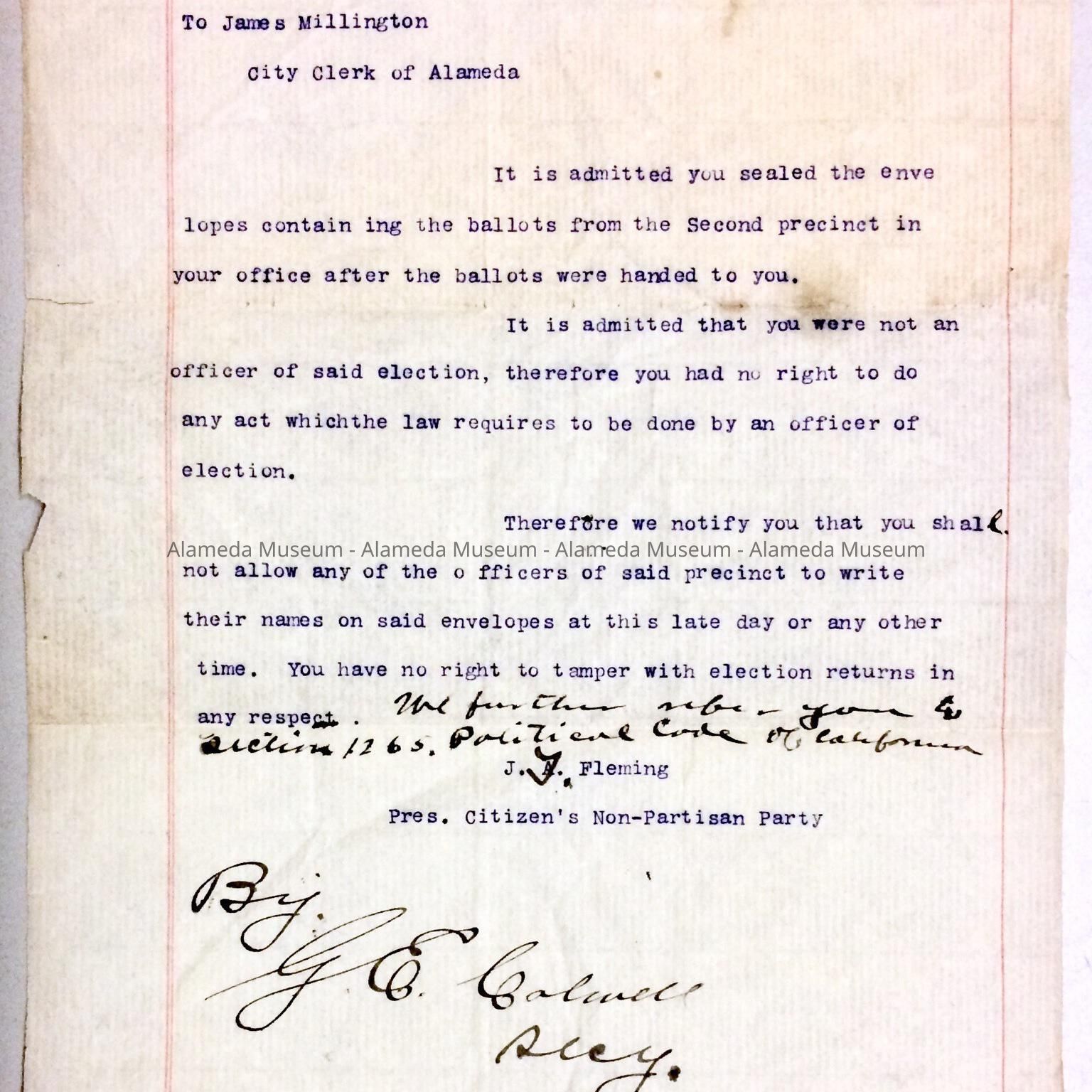 A LETTER ADDRESSED TO JAMES MILLINGTON, ALAMEDA CITY CLERK, AND SIGNED BY J A FLEMING, PRESIDENT, CITIZENS NONPARTISAN PARTY, ADMONISHING THE CITY CLERK AND OTHERS WHO HAD ANYTHING TO DO WITH SEALING OF ENVELOPES CONTAINING THE BALLOTS OF THE SECOND PRECINCT VOTES WHICH WERE TAKEN.