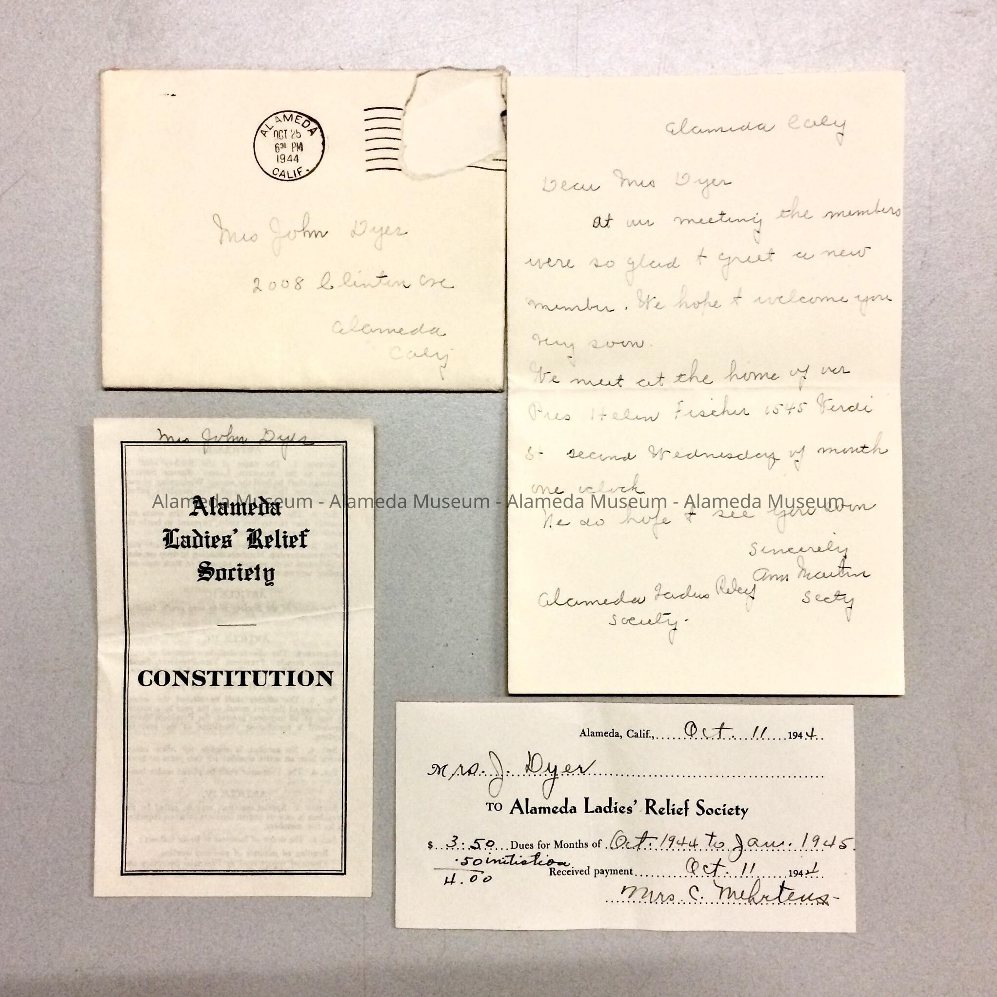 DESCRIPTION: LETTER WRITTEN TO THE LATE DOROTHY DYER (MRS. JOHN) ADDRESSED TO 2008 CLINTON AVENUE, ALAMEDA, CONGRATULATING HER ON HER MEMBERSHIP IN THE ALAMEDA LADIES' RELIEF SOCIETY. INCLUDED IN THE ENVELOPE IS A RECEIPT FOR HER MEMBER DUES, DATED OCTOBER 11, 1944, AND A 2-PAGE CONSTITUTION OF THE SOCIETY.