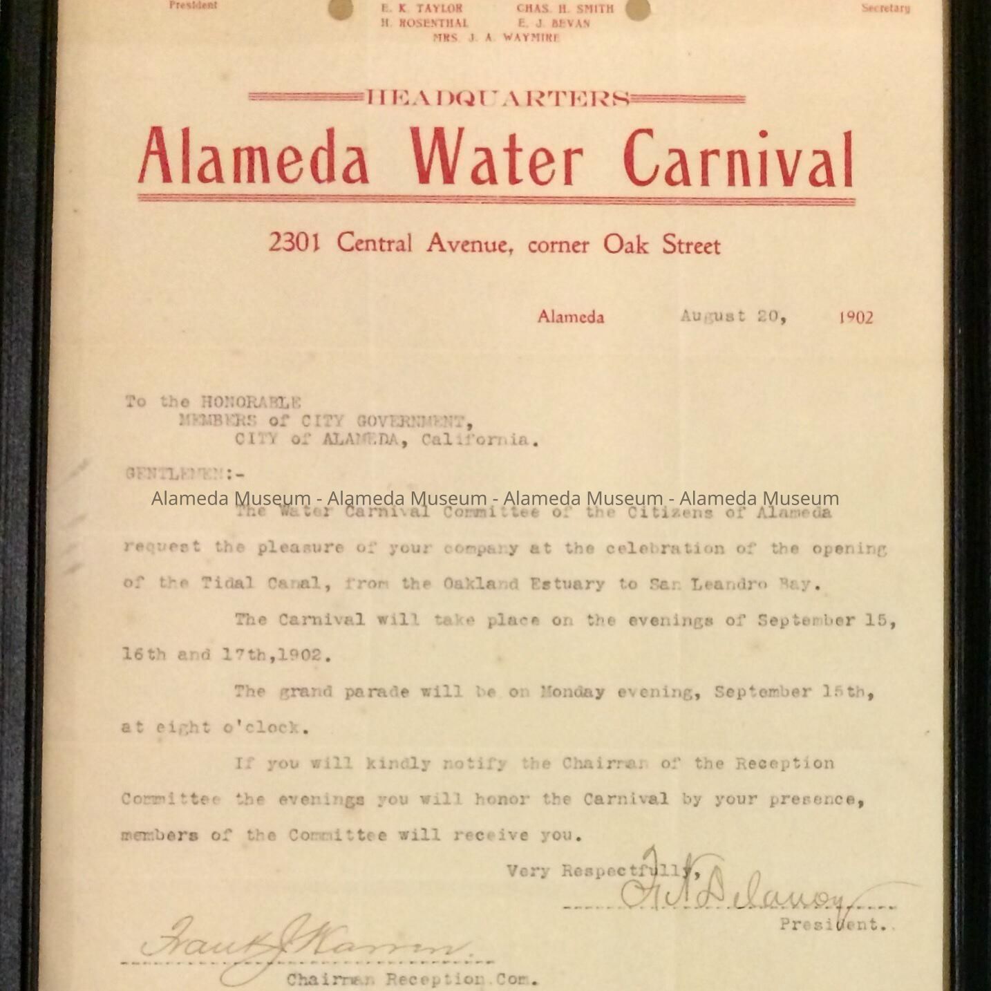 Description: Typewritten letter with bold printed caption (in red colored type) "Alameda Water Carnival." Letter in modern frame with ebonized finish.