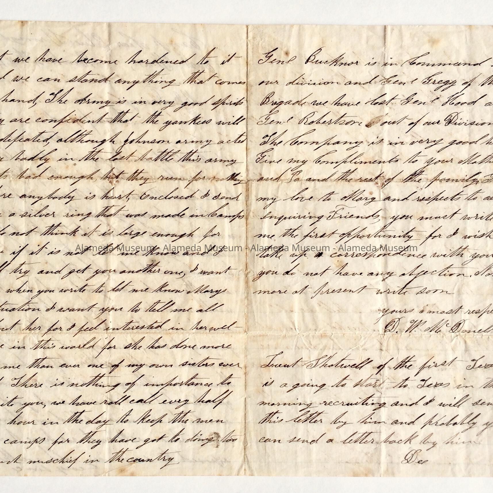 History: Letter written to 'Miss Fanny' by D.W. McDonnell. Letter found among effects of McDonell family, pioneers of Bay Farm Island. It appears McDonnell was fighting with the Confederate Army, 'confident the yankies will be defeated', 'although Johnson army acted very badly in the last battle this army acts bad enough, but they run for nothing before anybody is hurt', and 'General Bucknor is in Command of our division and Gen.l Gregg of the Brigade. We have lost Gen.l Wood and Gen.l Robertson out of our Division'.