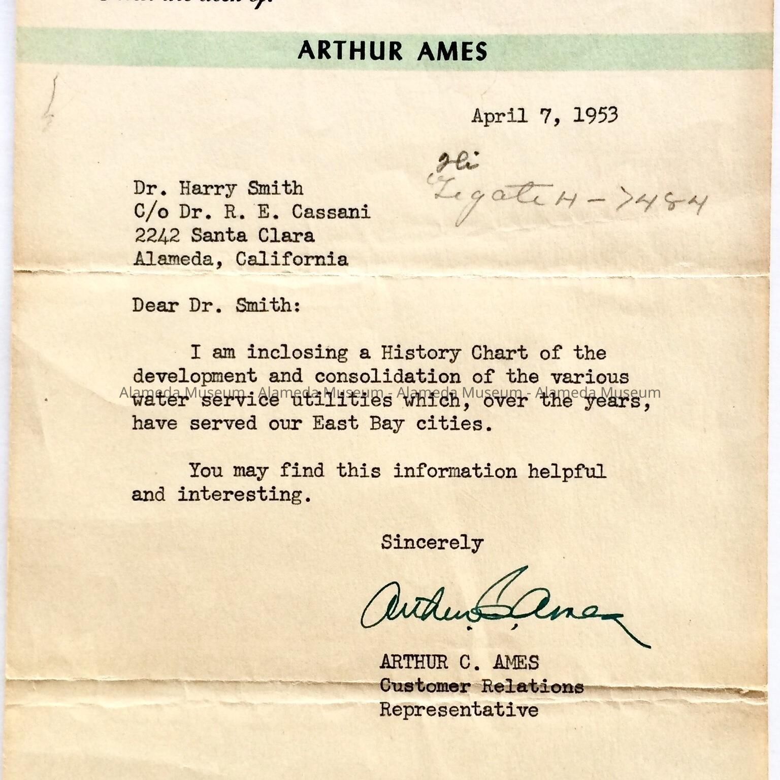 Letter addressed to the late Dr. Harry Smith. first Curator of the Alameda Historical Society. The letter is from Arthur C. Ames, Customer Relations Representative and refers to a history chart the Mr. Ames is sending to Dr. Smith concerning the various water service utilities which served East Bay cities. Letter is dated April 7. 1953.