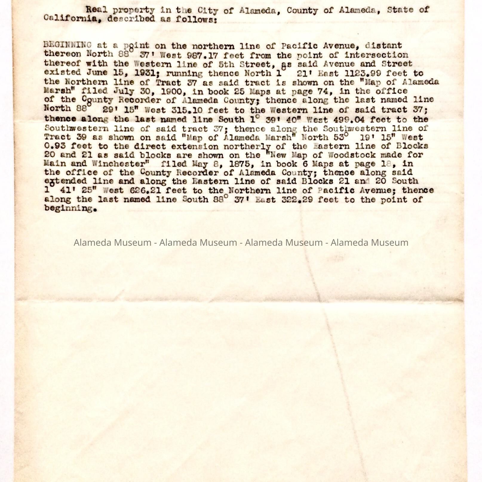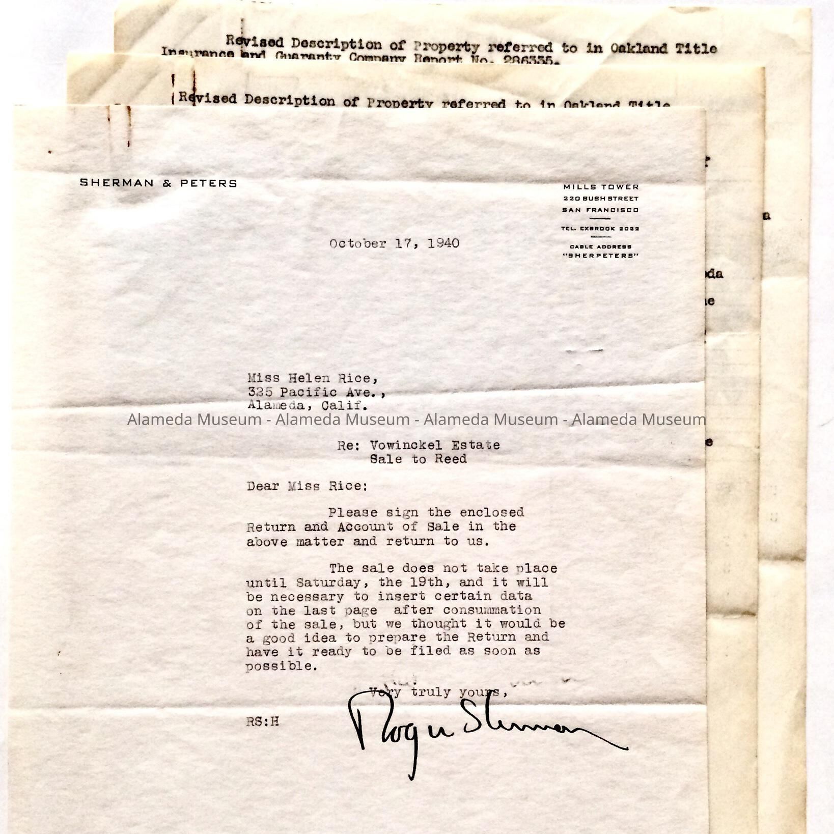 HISTORY OF OBJECT: A LETTER ADDRESSED TO HELEN F. RICE, 325 PACIFIC AVENUE, ALAMEDA, CONCERNING THE SALE OF THE DR. F. W. VOWINCKLE ESTATE. ALSO INCLUDED IS A LEGAL DESCRIPTION OF THE PROPERTY.