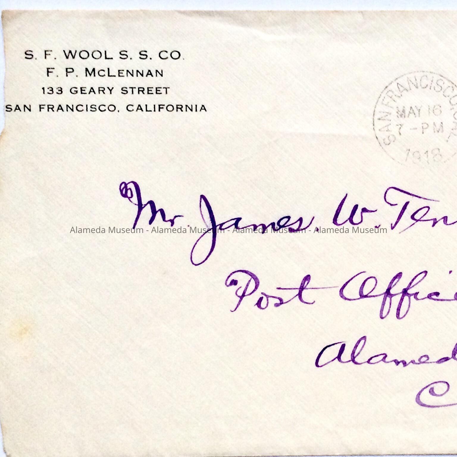 A. Envelope, addressed in purple ink, script, Mr. James W. Tennant, Post Office, Alameda, Calif, post marked S. F., May 16, 1918.