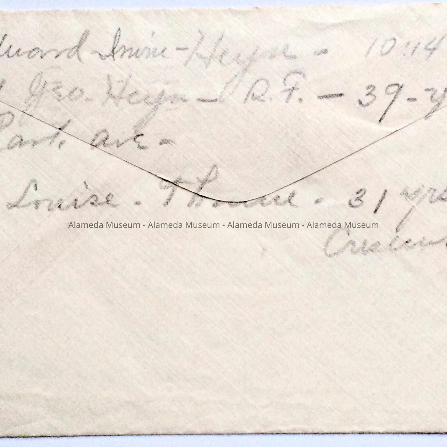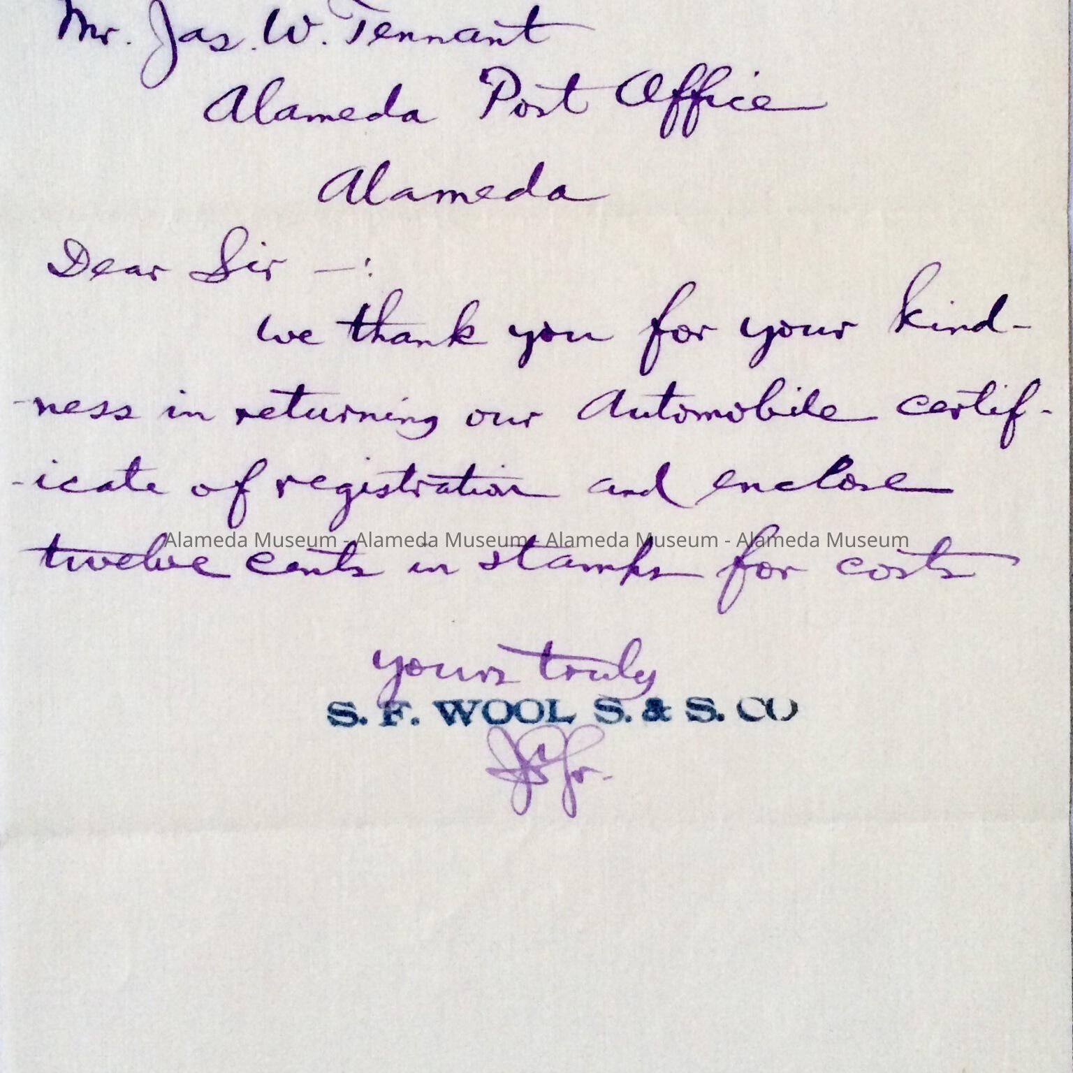 History of Object: Letter addressed to James W. Tennant (husband of Mabel), while an employee of the Alameda Post Office.