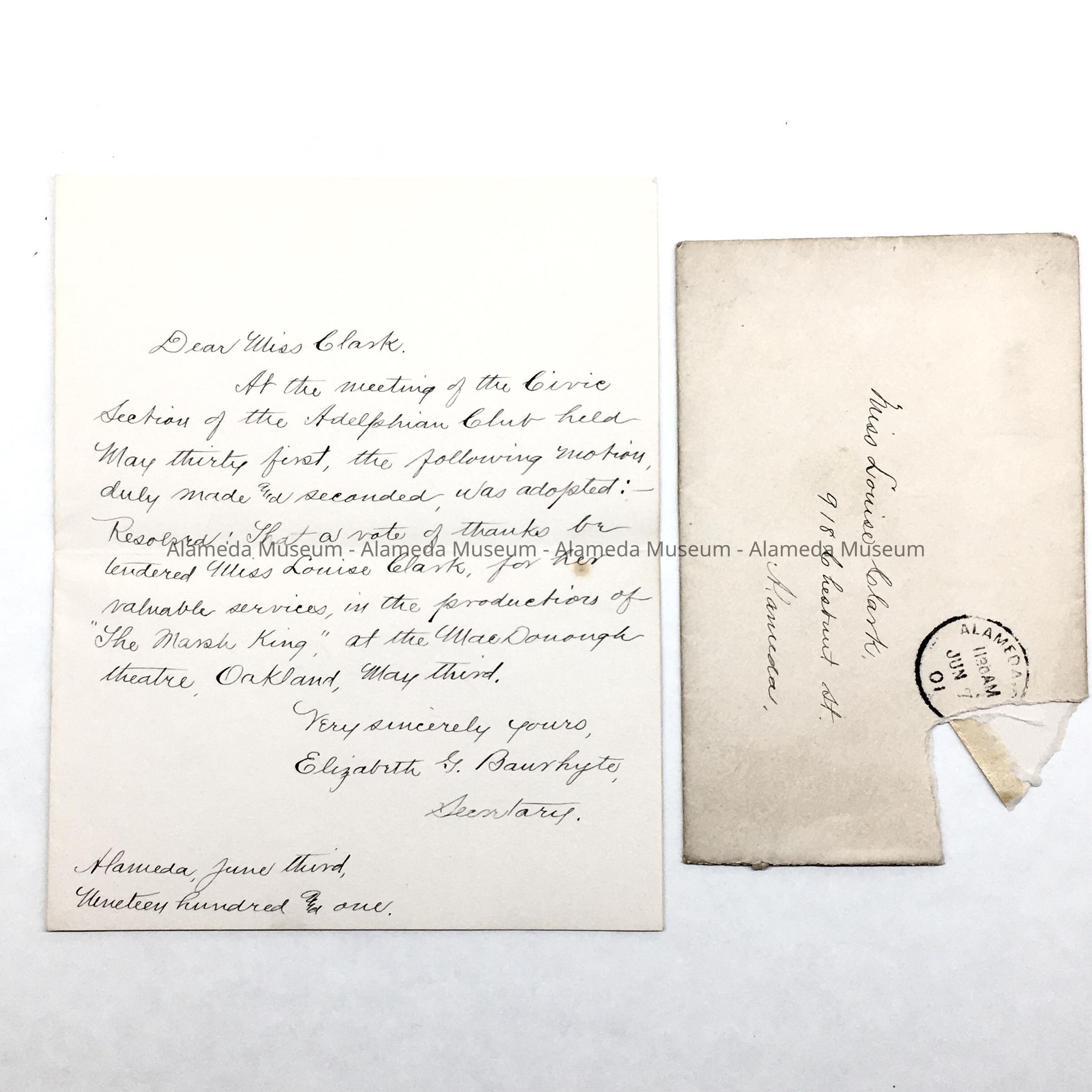 A HANDWRITTEN LETTER, ADDRESSED TO MS LOUISE CLARK, PRAISING HER PERFORMANCE IN THE OPERETTA, "THE MARSH KING," ' HELD AT THE MACDONOUGH THEATRE, OAKLAND, UNDER THE AUSPICES OF THE ADELPHIAN CLUB. LETTER IS SIGNED, "ELIZABETH G BAURHYTE, SECRETARY, ADELPHIAN CLUB," AND DATED JUNE 3, 1901.