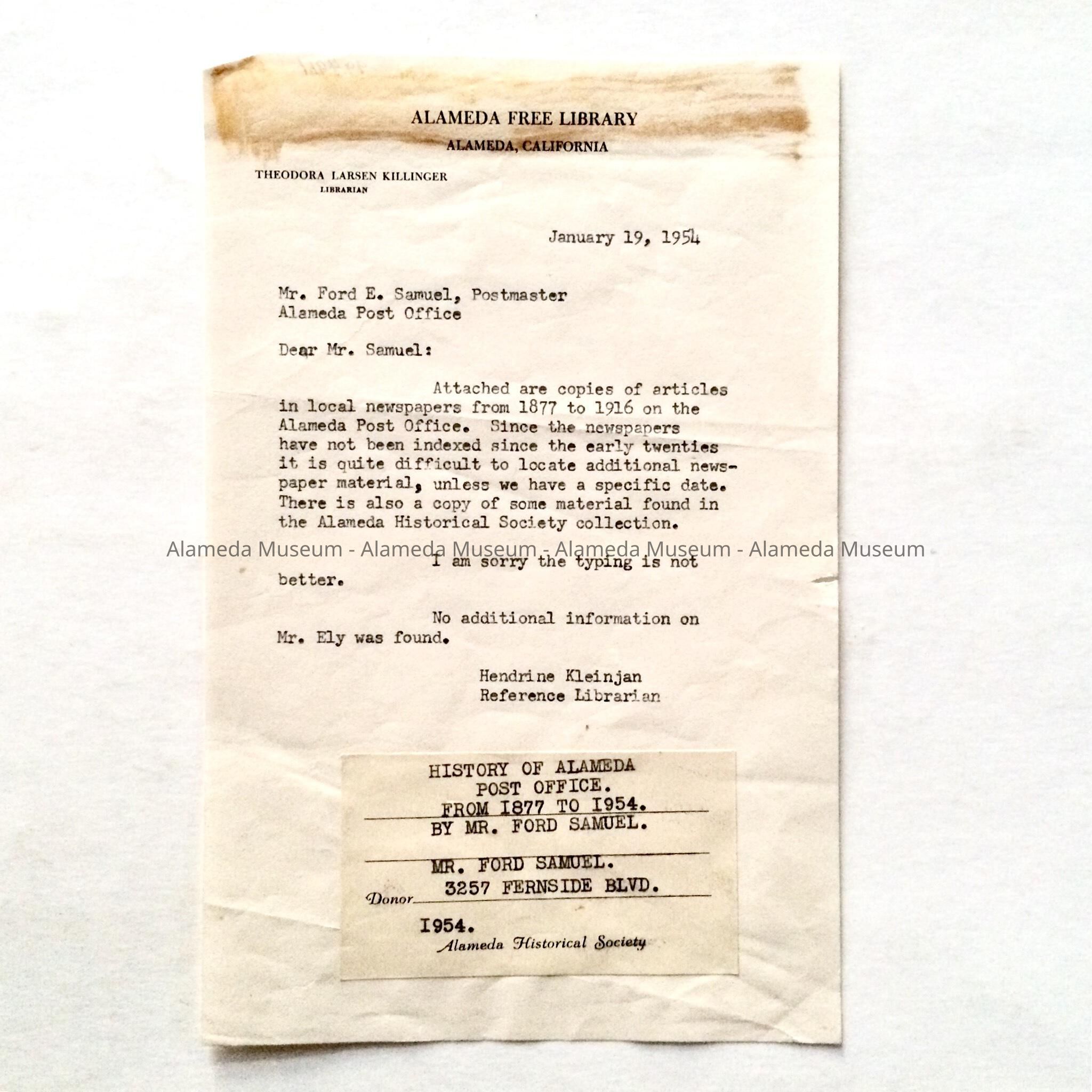 Letter addressed to Ford E. Samuel, Postmaster, City of Alameda, concerning information in the Alameda Free Library on the post office.