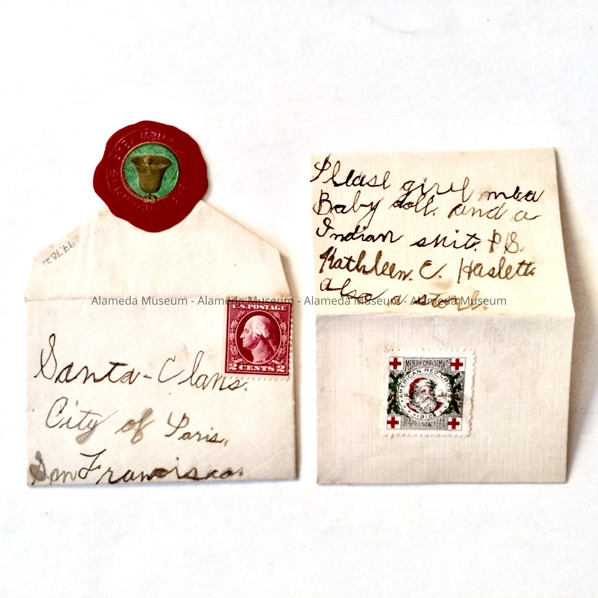 HISTORY OF OBJECT: LETTER ADDRESSED TO SANTA CLAUS, CITY OF PARIS, SAN FRANCISCO. WRITTEN BY KATHLEEN HASLETT (K H EDWARDS) AS A CHILD. SHE WAS THE DAUGHTER OF OLIVER C AND GISELLA HASLETT. THE HASLETT FAMILY LIVED AT 1427 SAN ANTONIO AVENUE, ALAMEDA. THE LATE MRS EDWARDS WAS THE COUSIN OF THE LATE DORIS HASLETT GOODMAN.