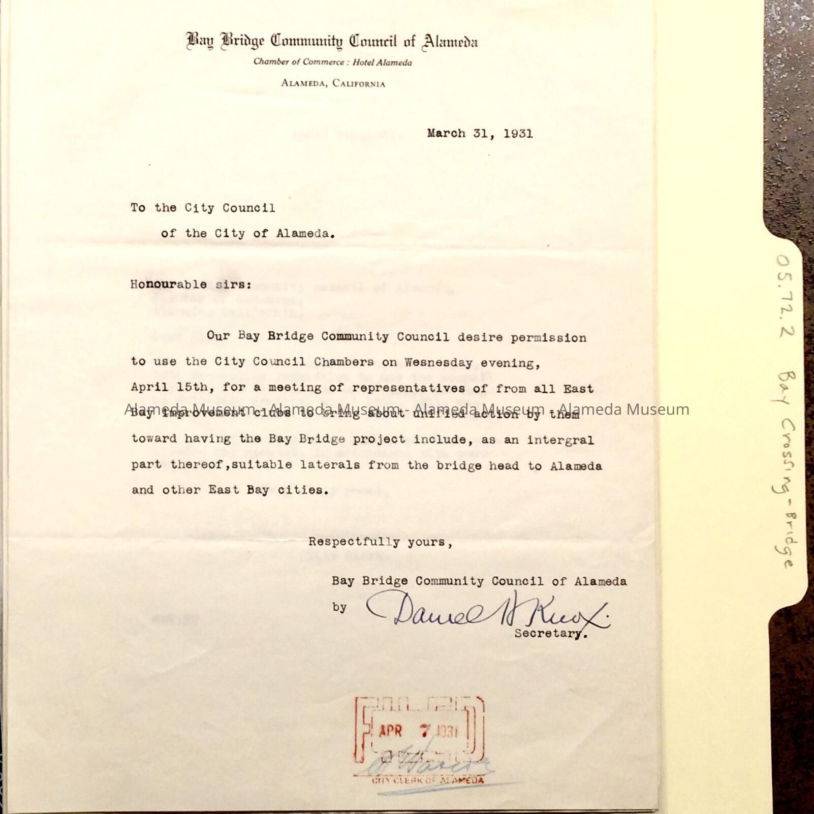 Letters from the San Francisco-Oakland Bay Bridge Advisory Committee, 1931Entry/Object ID