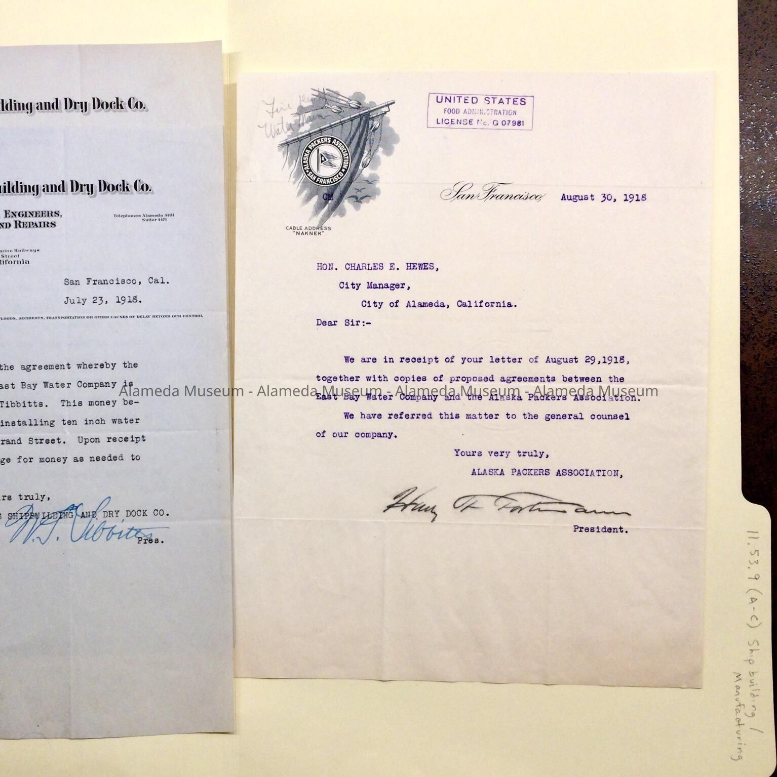 History of Object: Papers found among papers in the attic of City Hall prior to renovation, referring to agreements, for water supply for fire protection, between the East Bay Regional Water Company and the Barnes and Tibbits Shipbuilding Co., and Alaska Packers Association.