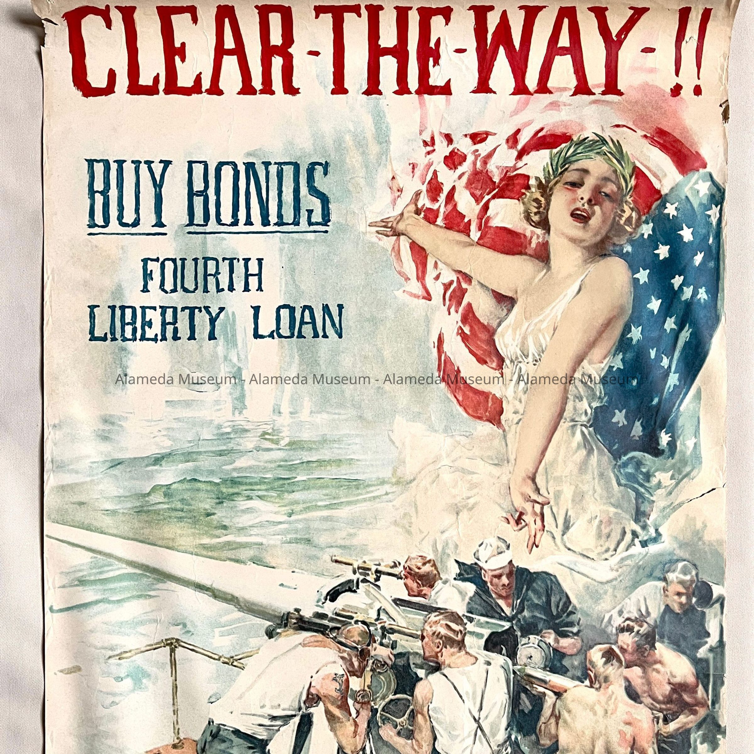 LITHOGRAPHIC POSTER --- "LIBERTY AND SAILORS MANNING ARTILLERY" --- WITH BOLD-PRINTED CAPTION, "CLEAR THE WAY," IN RED-COLORED TYPE.