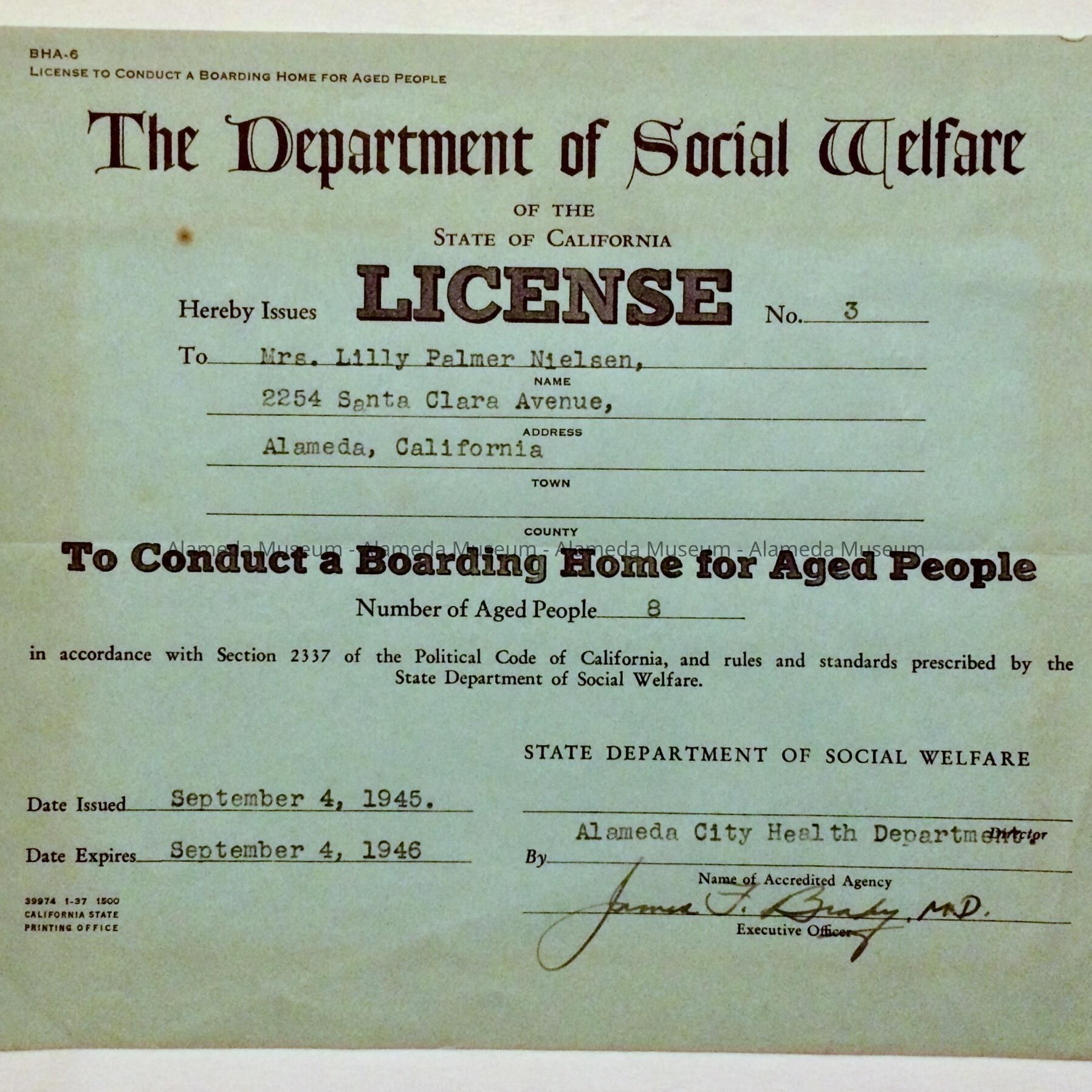 A LICENSE AWARDED TO LILLY PALMER NIELSEN, 2254 SANTA CLARA AVENUE, ALAMEDA, TO CONDUCT A BOARD HOME FOR AGED PEOPLE. THE LICENSE WAS ISSUED BY THE STATE DEPARTMENT OF SOCIAL WELFARE BY THE ALAMEDA CITY HEALTH DEPARTMENT ON SEPTEMBER 4, 1945.