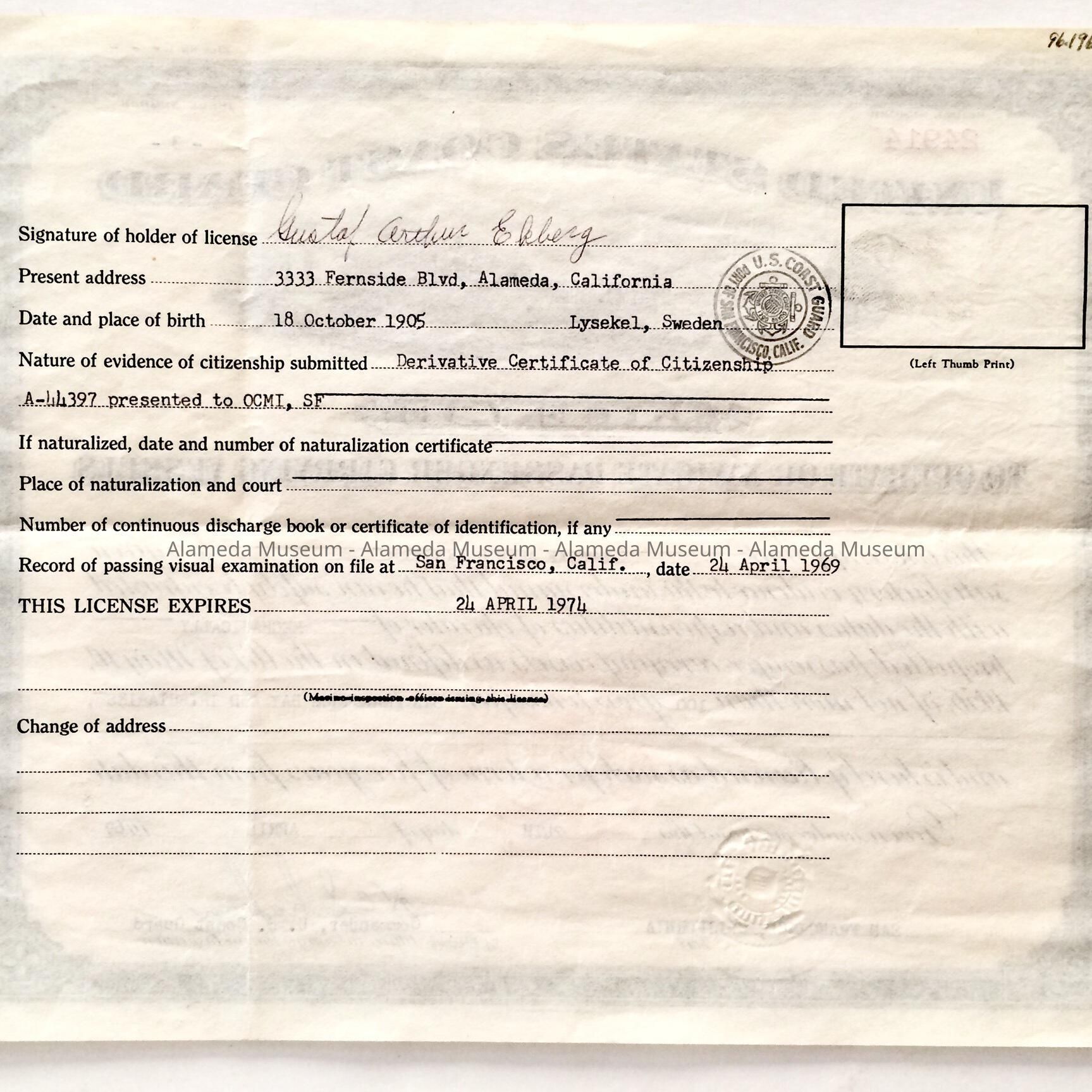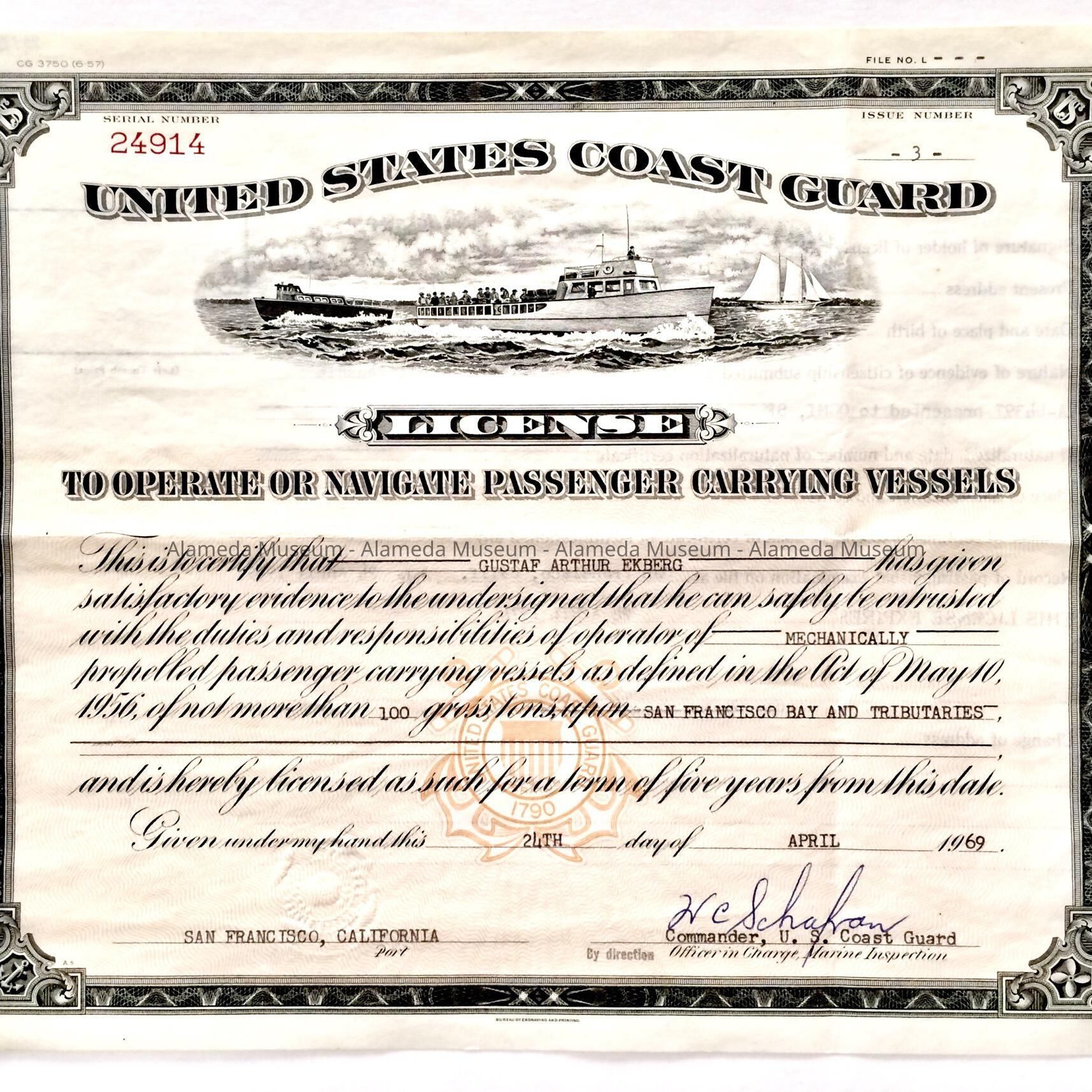 License to navigate passenger vessels of Gustaf Ekberg, issued by U.S. Coast Guard, 1969Entry/Object ID