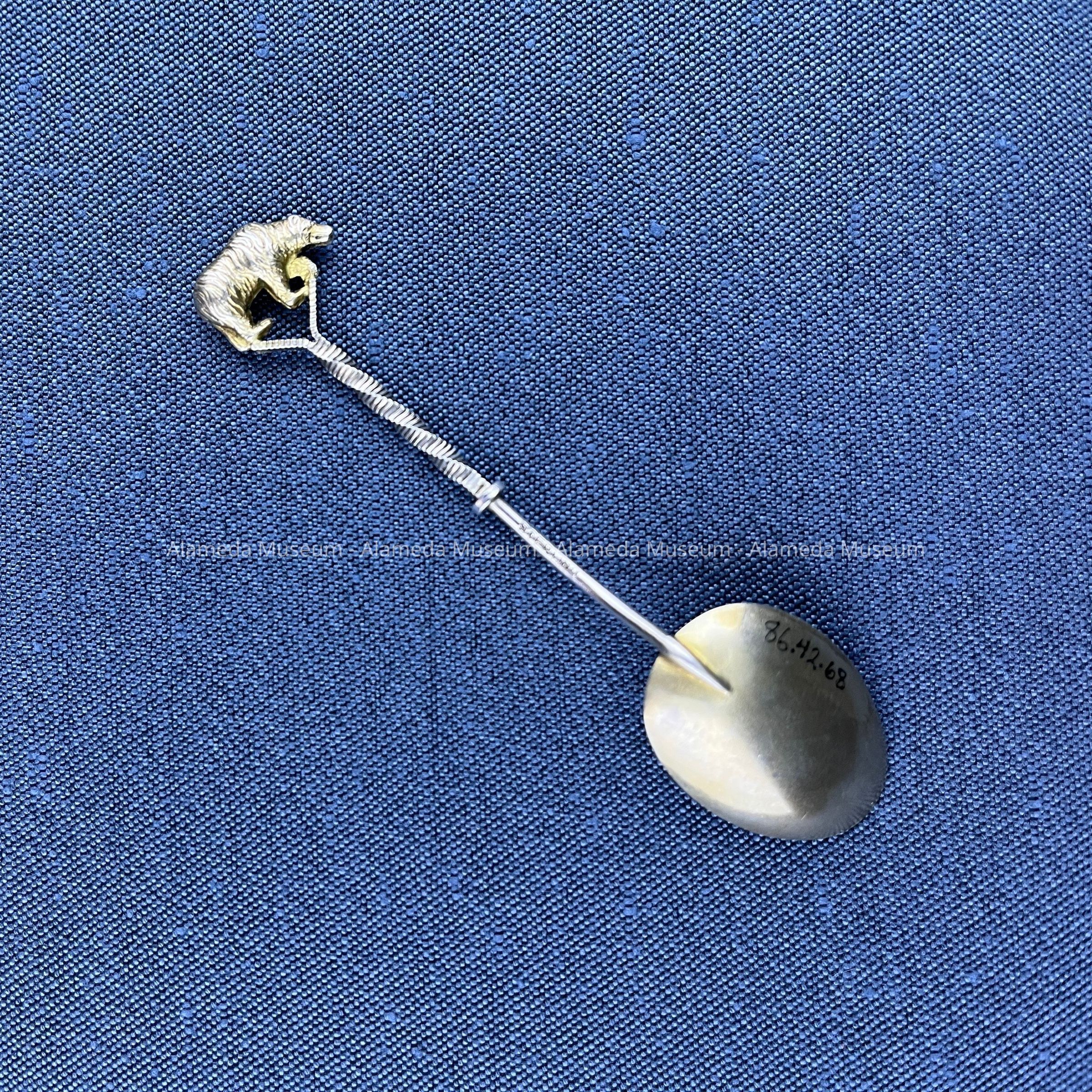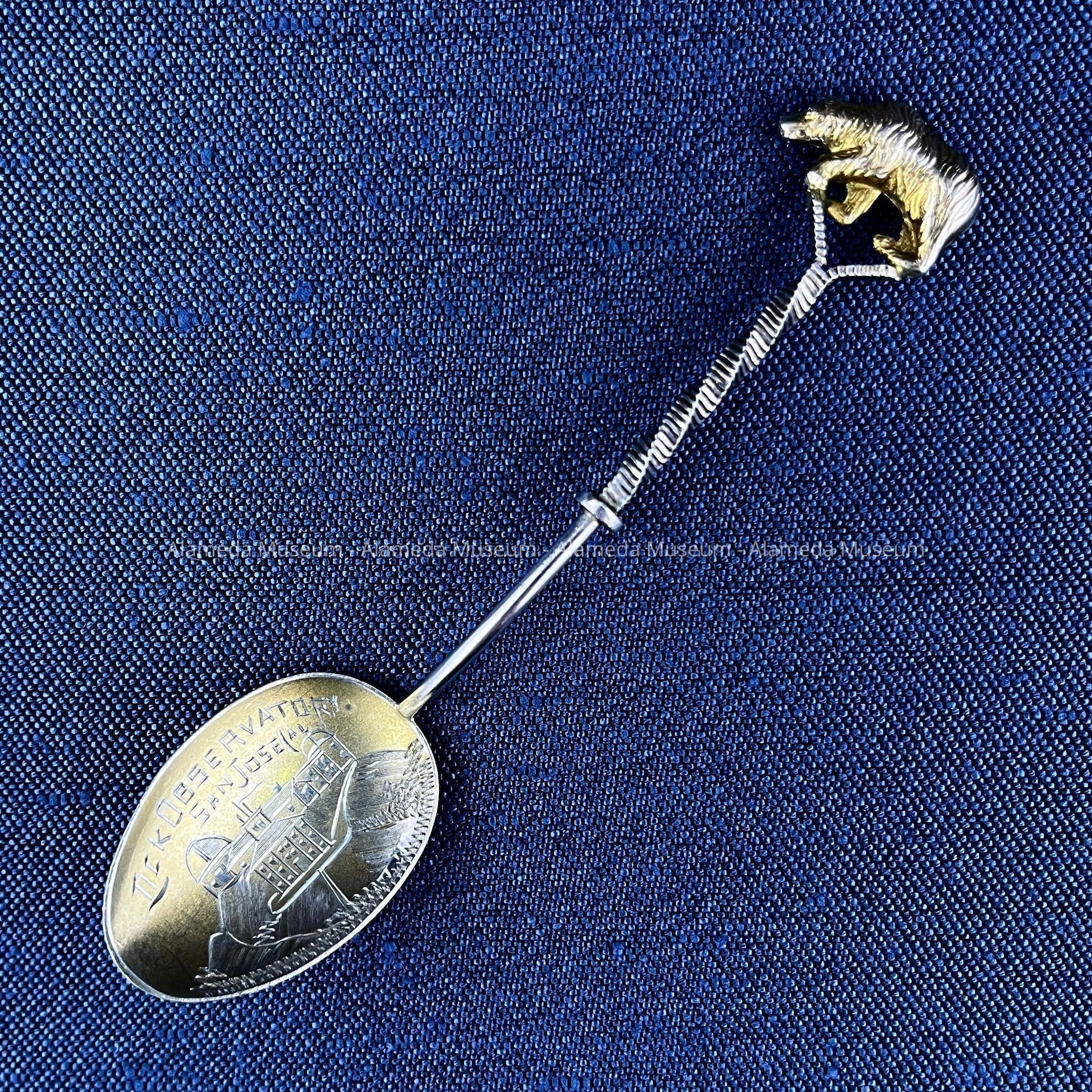 Description: Sterling silver demitasse spoon with engraved gold washed bowl representing Lick Observatory, San Jose, Cal. The decorative handle stem is twisted and terminates in a California brown bear (gold washed) finial.
