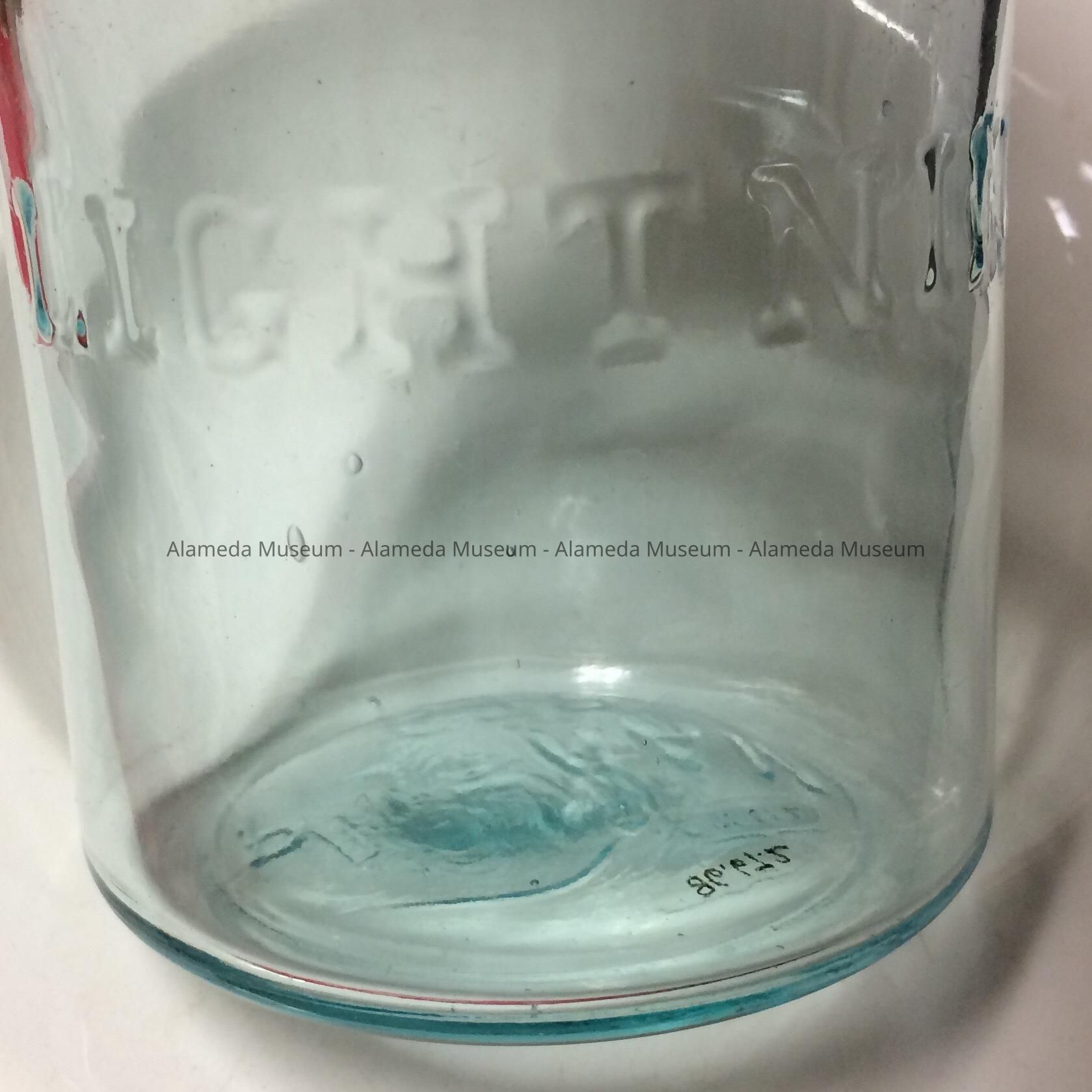 Description: Canning jar with glass lid (signed Lightning, Patd. April 25, 82) in an aquamarine color. Raised lettering on body of glass jar stating "Trade Mark-Lightning." Bail handle (metal) fastener.