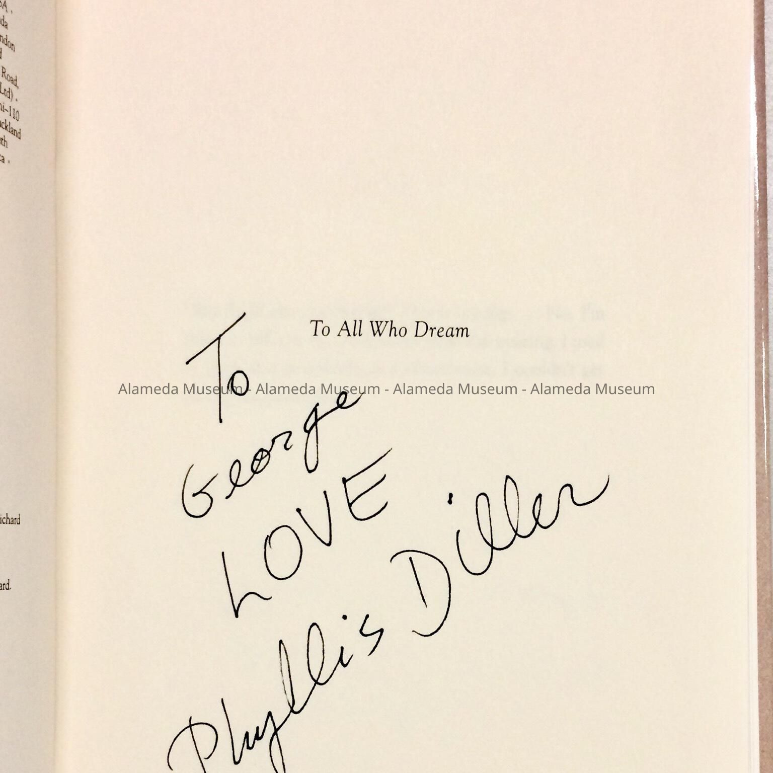 HISTORY OF OBJECT: AN AUTOBIOGRAPHY OF THE LATE STAND-UP COMIC, PHYLLIS DILLER, MAKING REFERENCE TO HER LIFE WHILE LIVING IN ALAMEDA. BOOK IS AUTOGRAPHED, "TO GEORGE GUNN, BY PHYLLIS DILLER."
