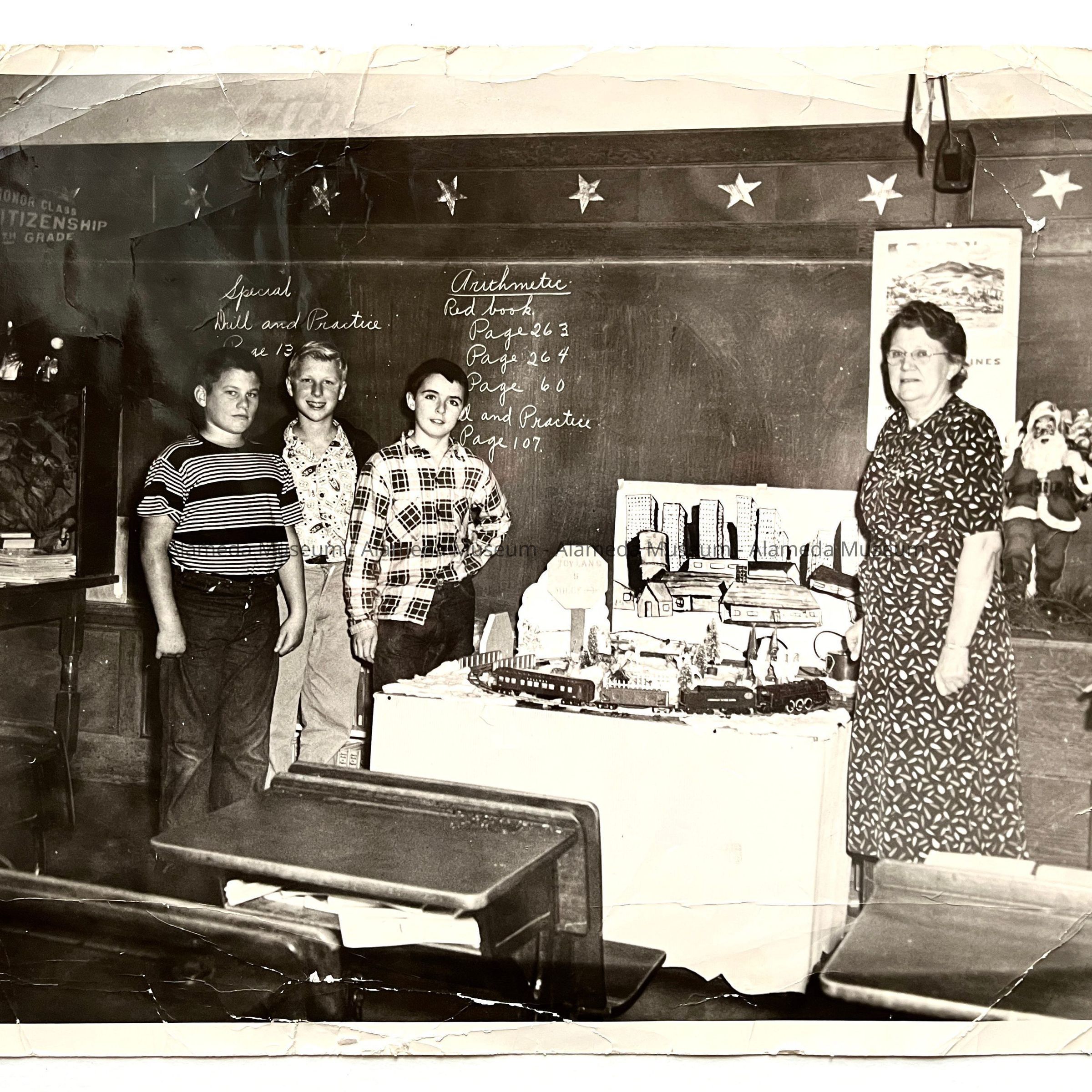 Description: black-and-white glossy photo with white edges, showing a school scene of 3 teenage boys and an older woman in front of black board next to a display including a model train set. On the right can be seen a Father Christmas Figure. School and people are identified in pencil on verso: Lloyd Wendland, Henry Schulz, Leonard Johnson, Mrs. Mulkey.