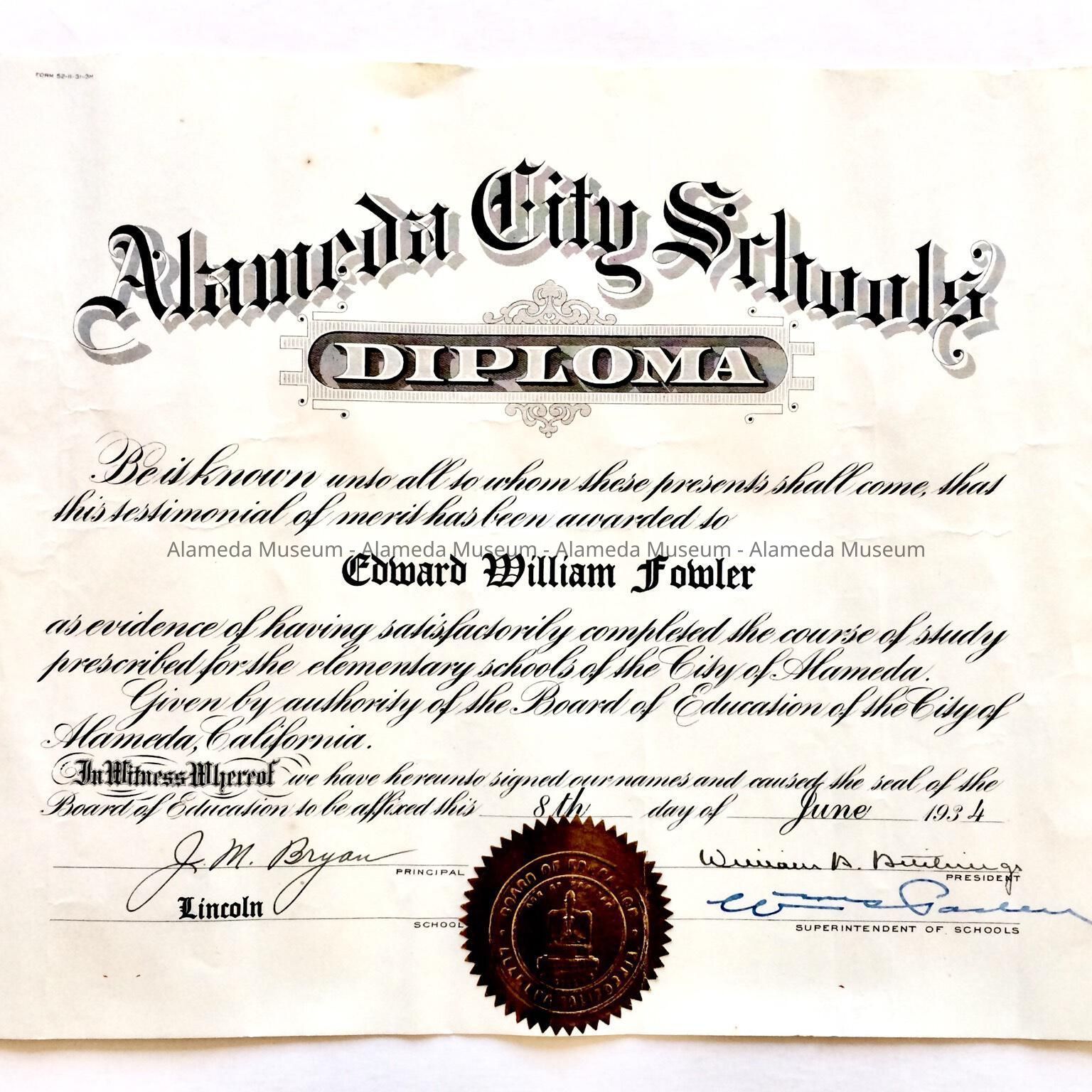 Description: Printed diploma with bold caption (in ornate type) "Alameda City Schools," & gold seal "Alameda Board of Education."