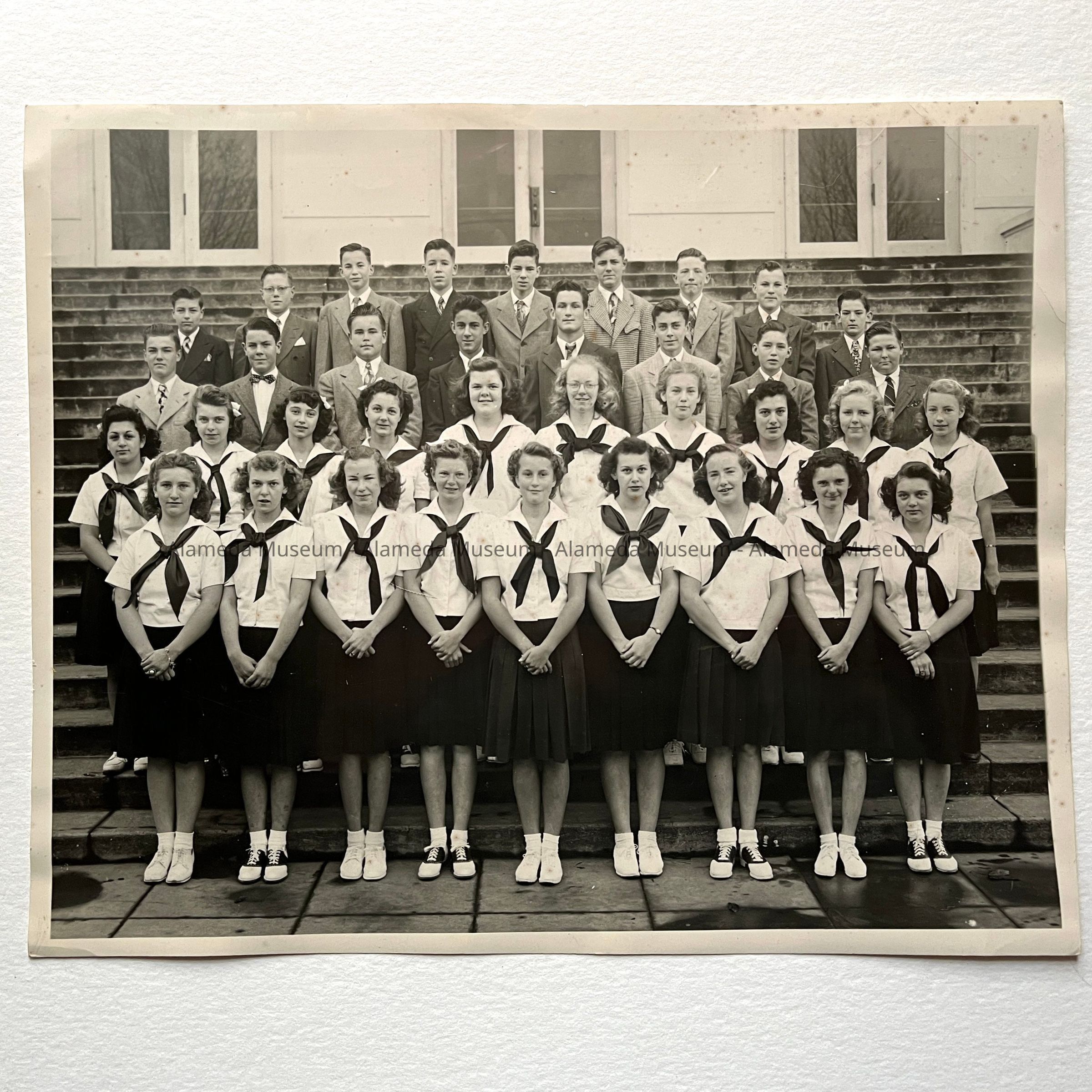 Description: A glossy black-and-white photo with white edges, of a group of young men and women posed on the stairs of a school. No identification on the photo. Likely a graduating class photo, with the men formally dressed in suit and tie, and the women wearing identical outfits of dark knee-length pleated skirts, white short-sleeved blouse, and knotted dark scarf. Photographer is identified by stamp on verso: Piatt's, 1350 Park St.
