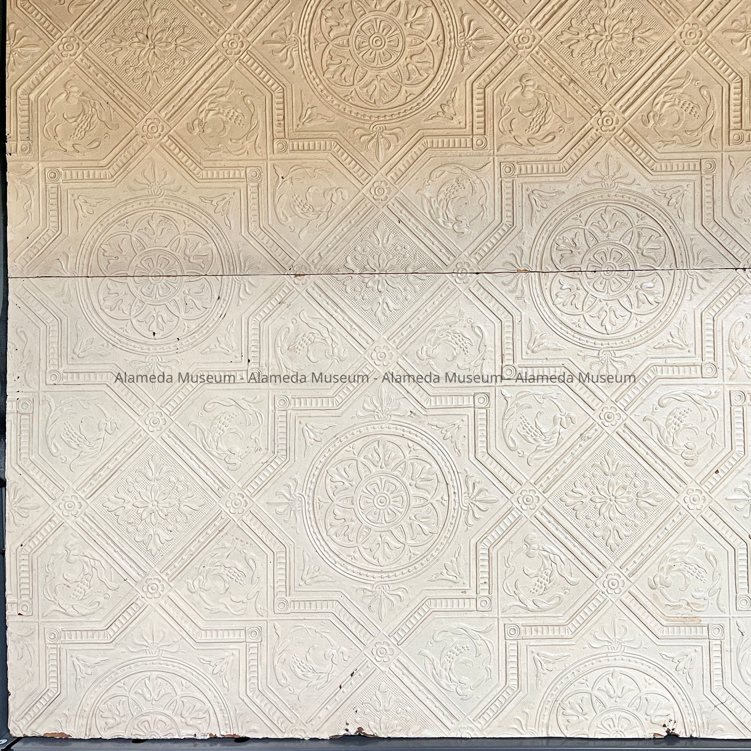 Description: 3 sections of a wallpaper with raised surface of a geometric design of a moorish design with circles and floral details. 2 sections are painted white, the third, smaller section, appears to have originally been dark reddish brown, and has a strip painted white.