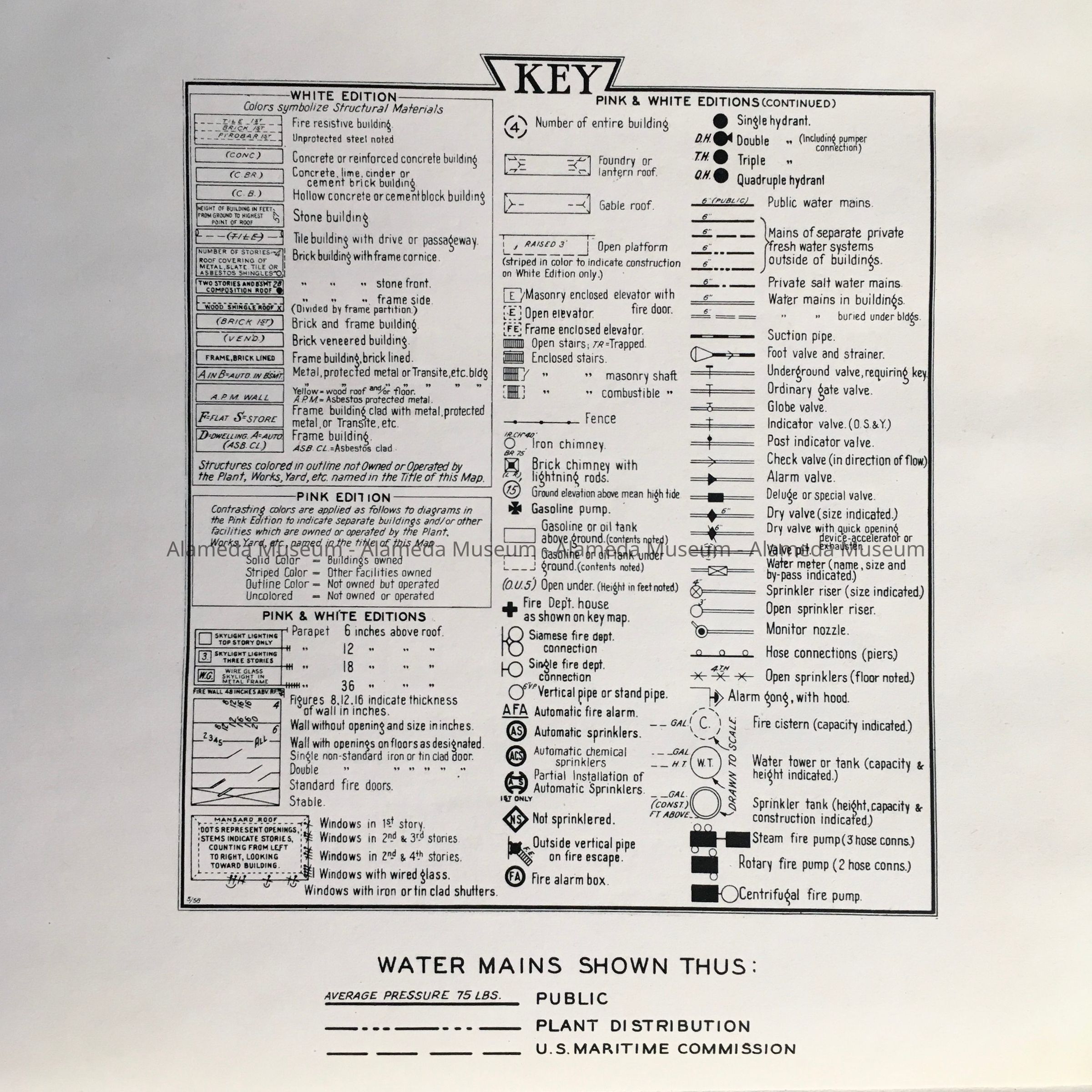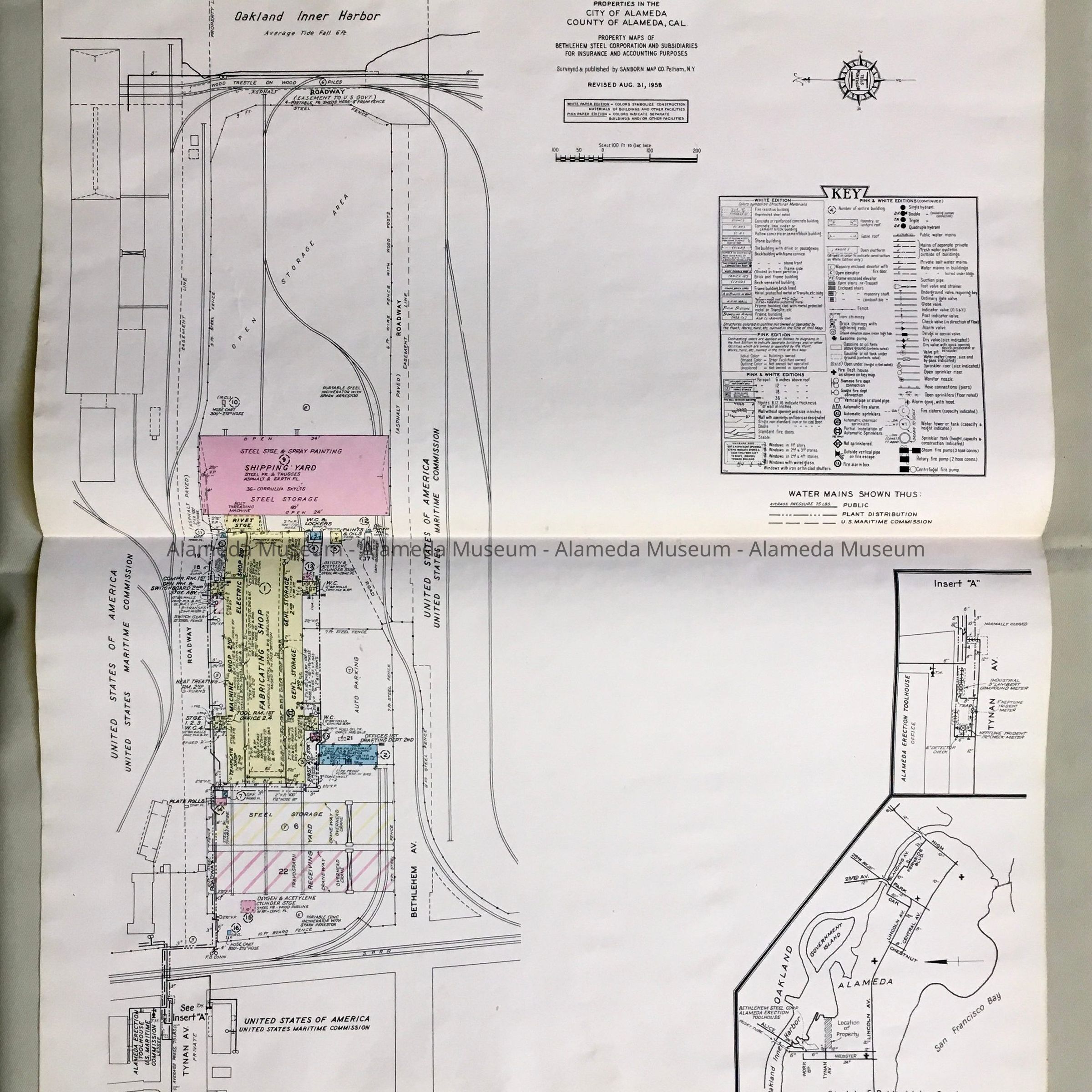 HISTORY OF OBJECT: A MAP OF THE ALAMEDA FABRICATING WORKS PROPERTY IN THE CITY OF ALAMEDA. MAP INCLUDES BETHLEHEM STEEL CORP. MAP WAS SURVEYED AND PUBLISHED BY THE SANBORN MAP COMPANY. REVISED AUGUST 31, 1958. LOCATION OF PROPERTY WAS BETWEEN WEBSTER STREET (EAST SIDE) AND THE ESTUARY.