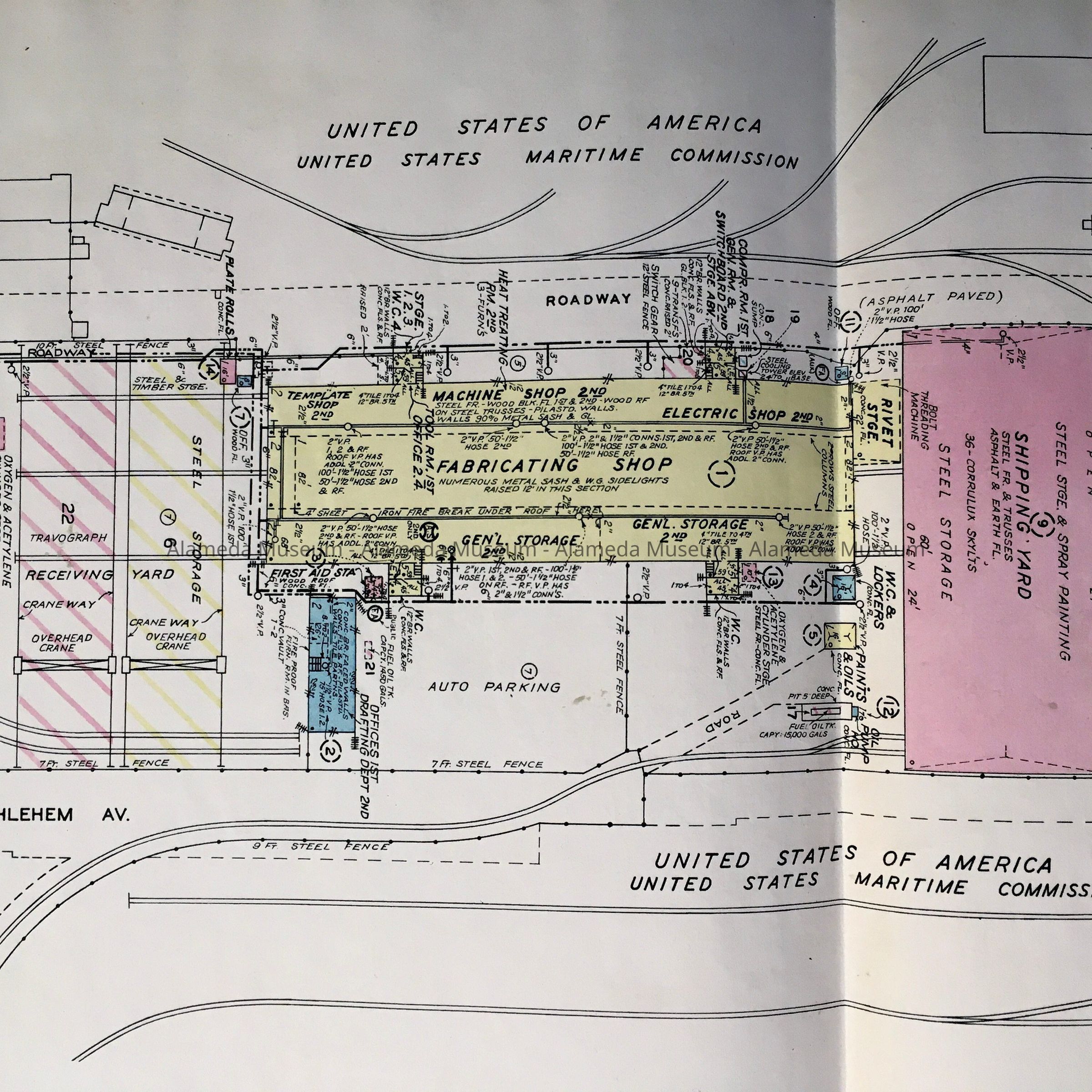 DESCRIPTION: A MAP PRINTED ON PAPER THAT IS LINEN-MOUNTED. MAP IS PREDOMINATELY TYPED BY AREAS TO BE DEFINED IN COLORS OF PINK, YELLOW, AND BLUE. MAP HAS A BOLD-PRINTED CAPTION, "ALAMEDA FABRICATING WORKS."