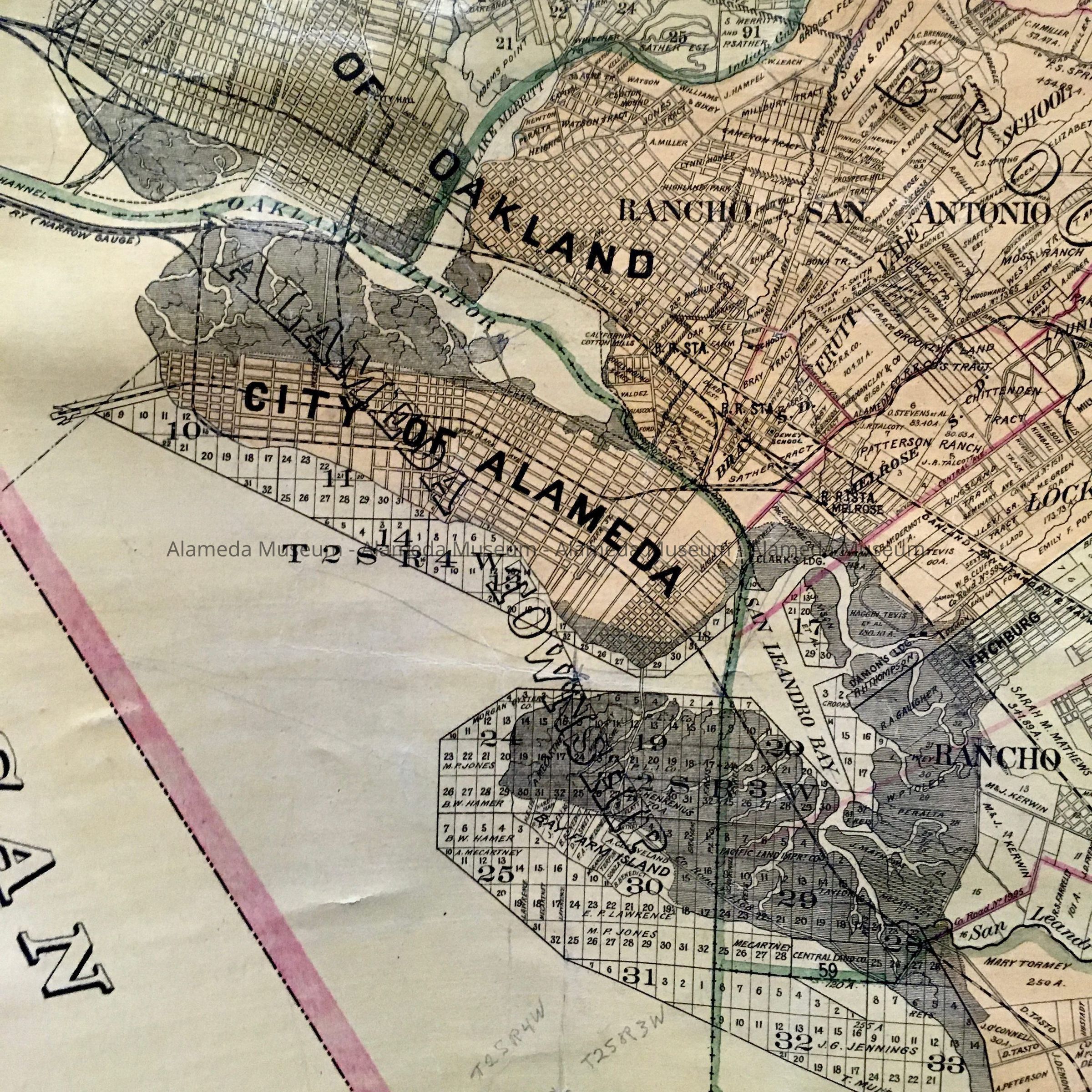 HISTORY OF OBJECT: Official map of Alameda County, California, dated 1900 and published by the Tribune Publishing Company. The map includes the City of Alameda and shows the route of the steam train into Alameda and the old ferry mole. Gives an accurate record of the railroad from San Leandro and Oakland into Alameda and the location of the mole.
