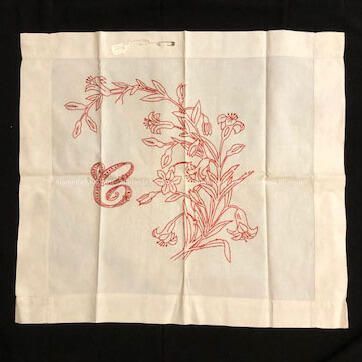 PAIR OF WHITE LINEN PILLOW SHAMS, WITH RED EMBROIDERED FLOWERS AND LEAVES AND THE INITIAL "C."